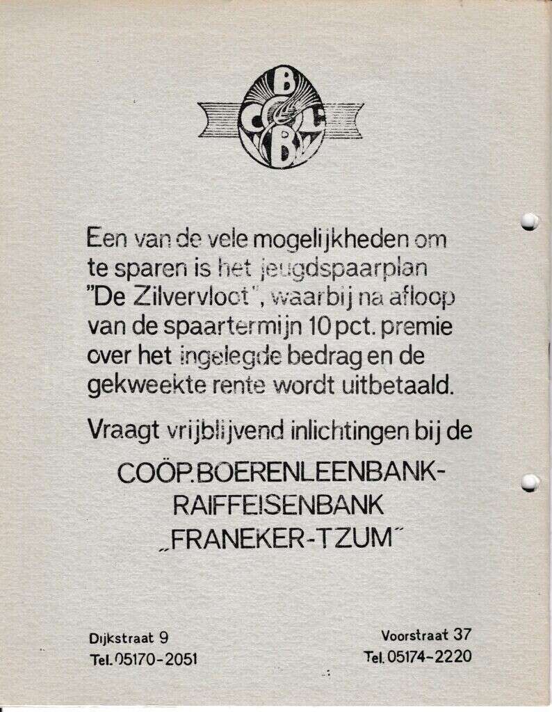 Beschrijving:It Fleurige Flittergat: 1968 4de jaargang nr. 17: Coöperatieve Boerenleenbank Franeker, Zilvervloot sparen