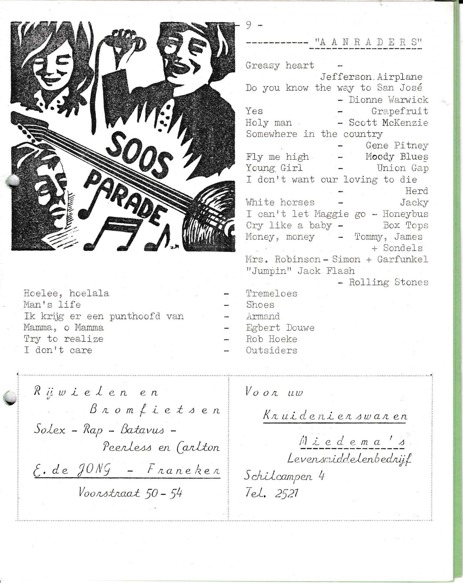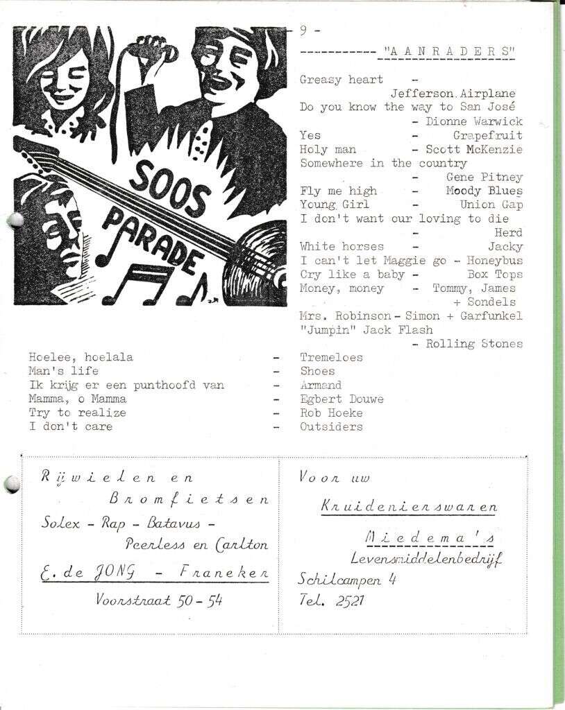 | Beschrijving: | It Fleurige Flittergat: 1968 4de jaargang nr. 19: Soosparade. Reklame; E.de Jong rijwielen en bromfietsen Voorstraat 50-54, Miedema Kruidenier Schilcampen 4. |