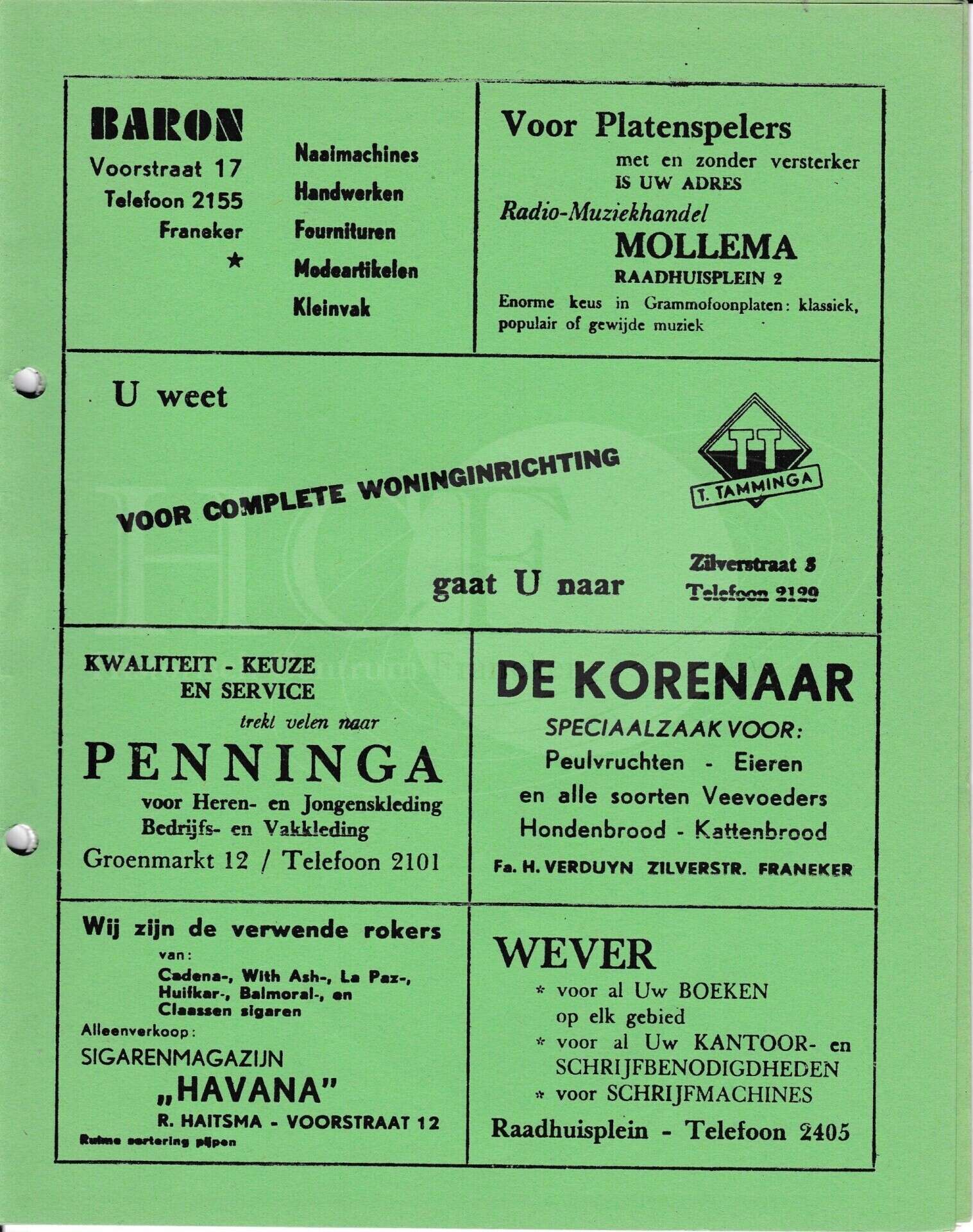 | Beschrijving: | It Fleurige Flittergat: 1968 4de jaargang nr. 19: Reklame; Baron naaimachines Voorstraat 17, Radio-muziekhandel Mollema Raadhuisplein 2 , Woninginrichting T.Tamminga Zilverstraat 3, Herenmode Penninga Groenmarkt 12, De Korenaar, zilverstraat 58, Sigarenmagazijn"Havana" K.Sijtsma Voorstraat 12, Boekhandel Wever Raadhuisplein 4 |