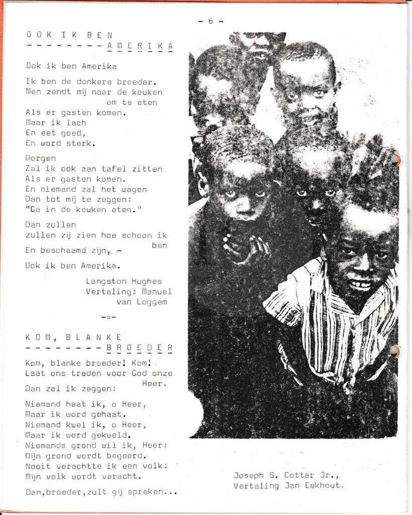 Beschrijving:It Fleurige Flittergat: 1968 4ste jaargang nr. 20: gedichten: "Ook ik ben Amerika" (Langston Hughes) en "Kom blanke broeders".(Joseph Cotter Jr.)