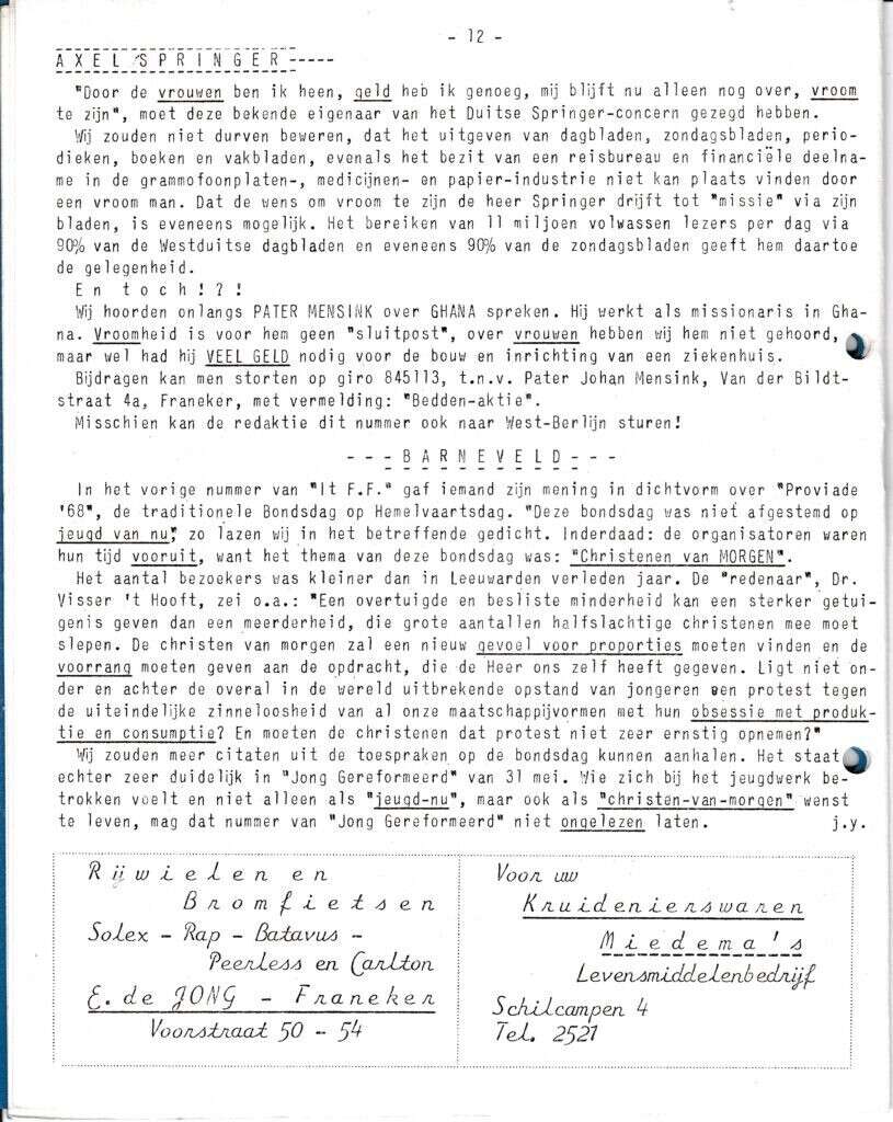 | Beschrijving: | It Fleurige Flittergat: 1968 4ste jaargang nr. 21: Moderne Literatuur: Axel Springer. Proviade '68 bondsdag op Hemelvaartsdag. |
