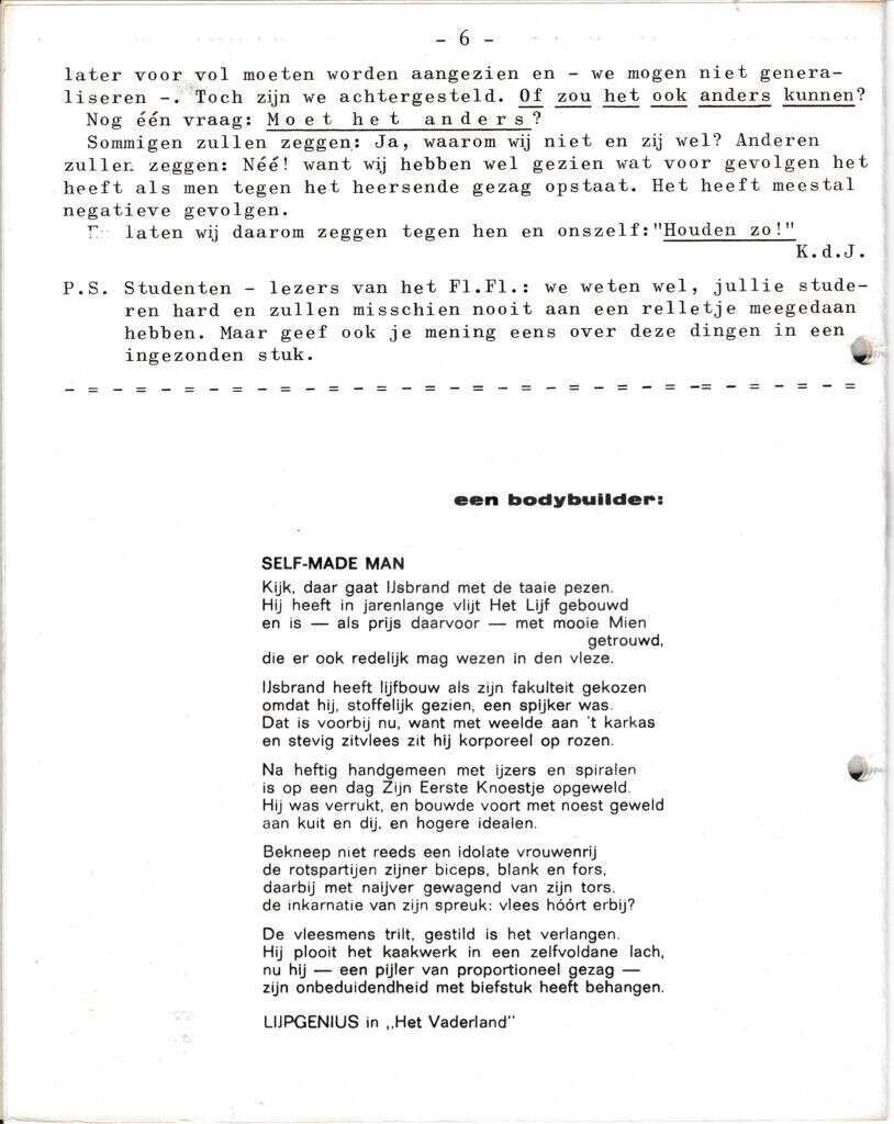 | Beschrijving: | It Fleurige Flittergat: 1968 4ste jaargang nr. 22: vervolg Privileges van de Student. De bodybuilder |