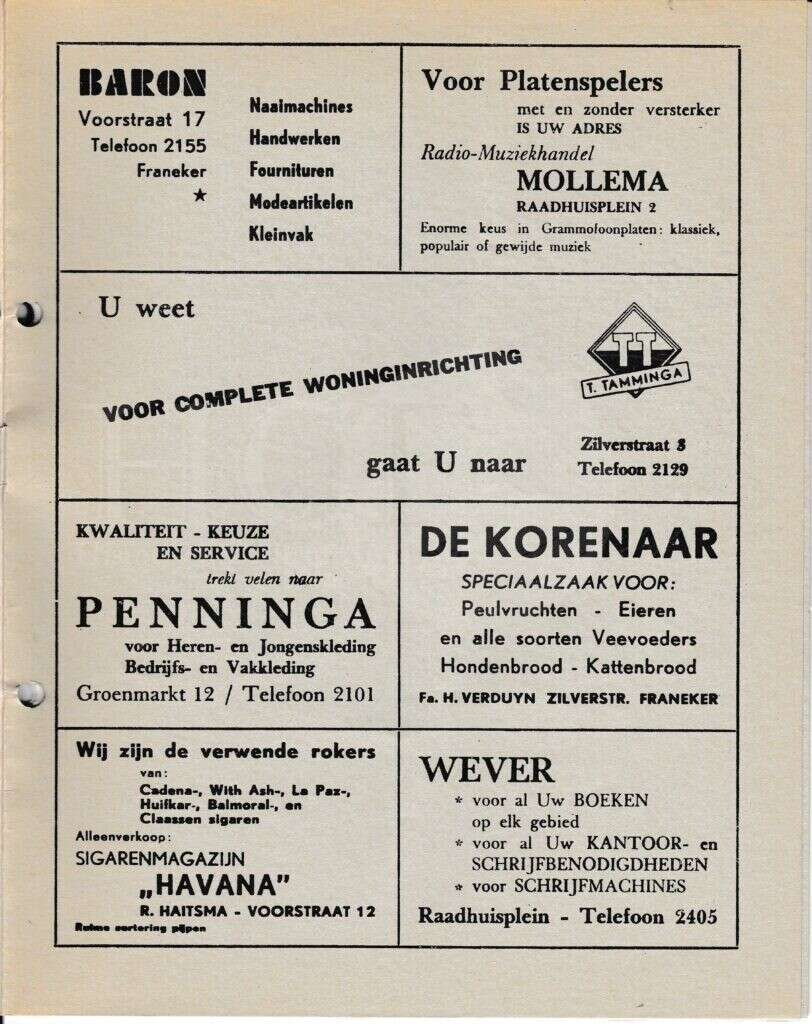 Beschrijving:It Fleurige Flittergat: 1968 4ste jaargang nr. 22: Reklame; Baron naaimachines Voorstraat 17, Radio-muziekhandel Mollema Raadhuisplein 2 , Woninginrichting T.Tamminga Zilverstraat 3, Herenmode Penninga Groenmarkt 12, De Korenaar, zilverstraat 58, Sigarenmagazijn"Havana" K.Sijtsma Voorstraat 12, Boekhandel Wever Raadhuisplein 4