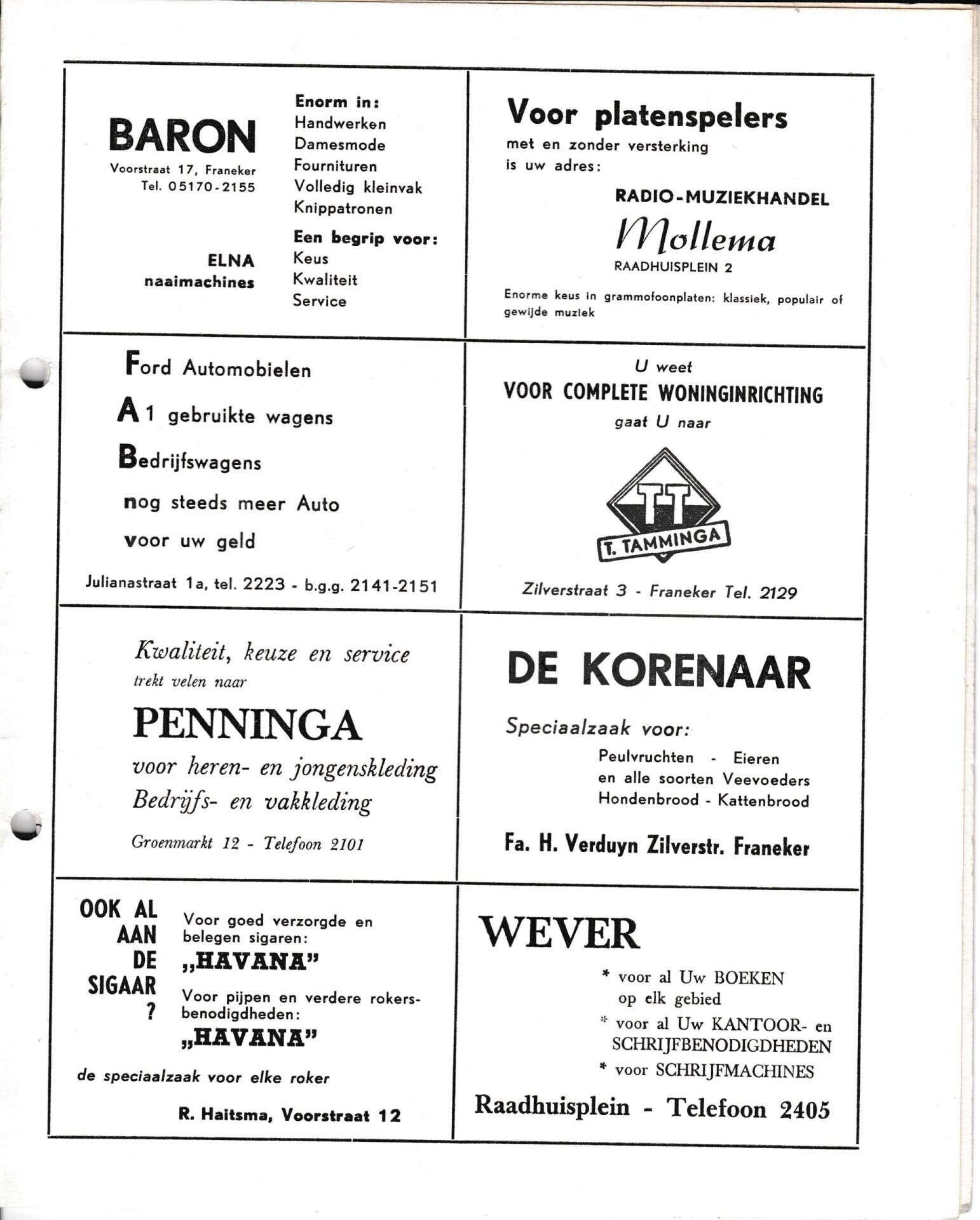 | Beschrijving: | It Fleurige Flittergat: 1968 5ste jaargang nr. 0 Voetbal:It Fleurige Flittergat: 1968 4ste jaargang nr. 22: Reklame; Baron naaimachines Voorstraat 17, Radio-muziekhandel Mollema Raadhuisplein 2 , F.A.B Julianastraat 1, Woninginrichting T.Tamminga Zilverstraat 3, Herenmode Penninga Groenmarkt 12, De Korenaar, zilverstraat 58, Sigarenmagazijn"Havana" K.Sijtsma Voorstraat 12, Boekhandel Wever Raadhuisplein 4 |