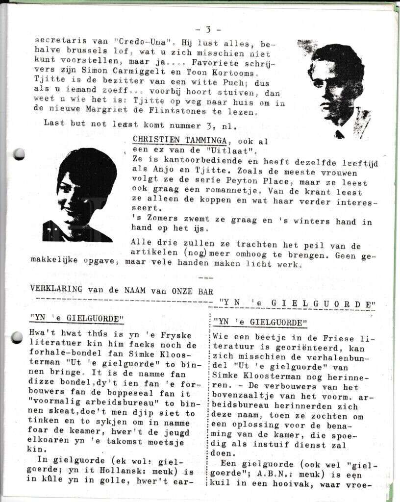 | Beschrijving: | It Fleurige Flittergat: 1968 5ste jaargang nr. 1: vervolg Nieuwe redacteur en redactrices. Ano Huizenga, Christien Tamminga en Tjitte Wever. Bar "Yn'e Gielguorde" |