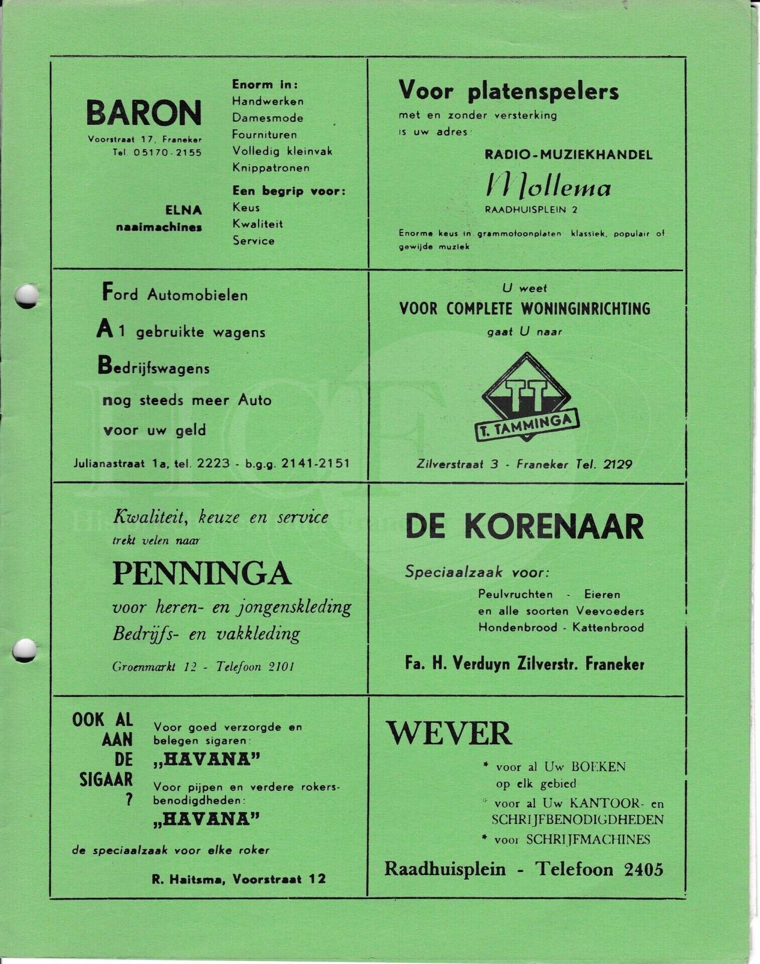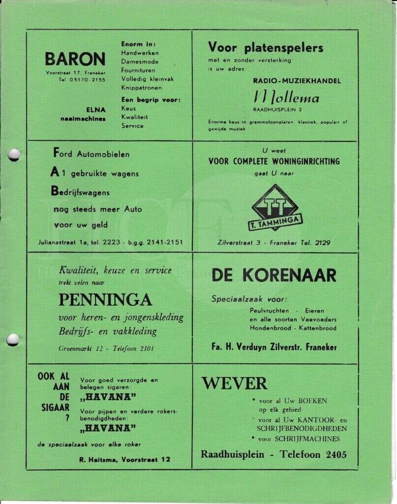 | Beschrijving: | It Fleurige Flittergat: 1968 5ste jaargang nr. 1: Reklame; Baron naaimachines Voorstraat 17, Radio-muziekhandel Mollema Raadhuisplein 2 , F.A.B Julianastraat 1, Woninginrichting T.Tamminga Zilverstraat 3, Herenmode Penninga Groenmarkt 12, De Korenaar, zilverstraat 58, Sigarenmagazijn"Havana" K.Sijtsma Voorstraat 12, Boekhandel Wever Raadhuisplein 4 |