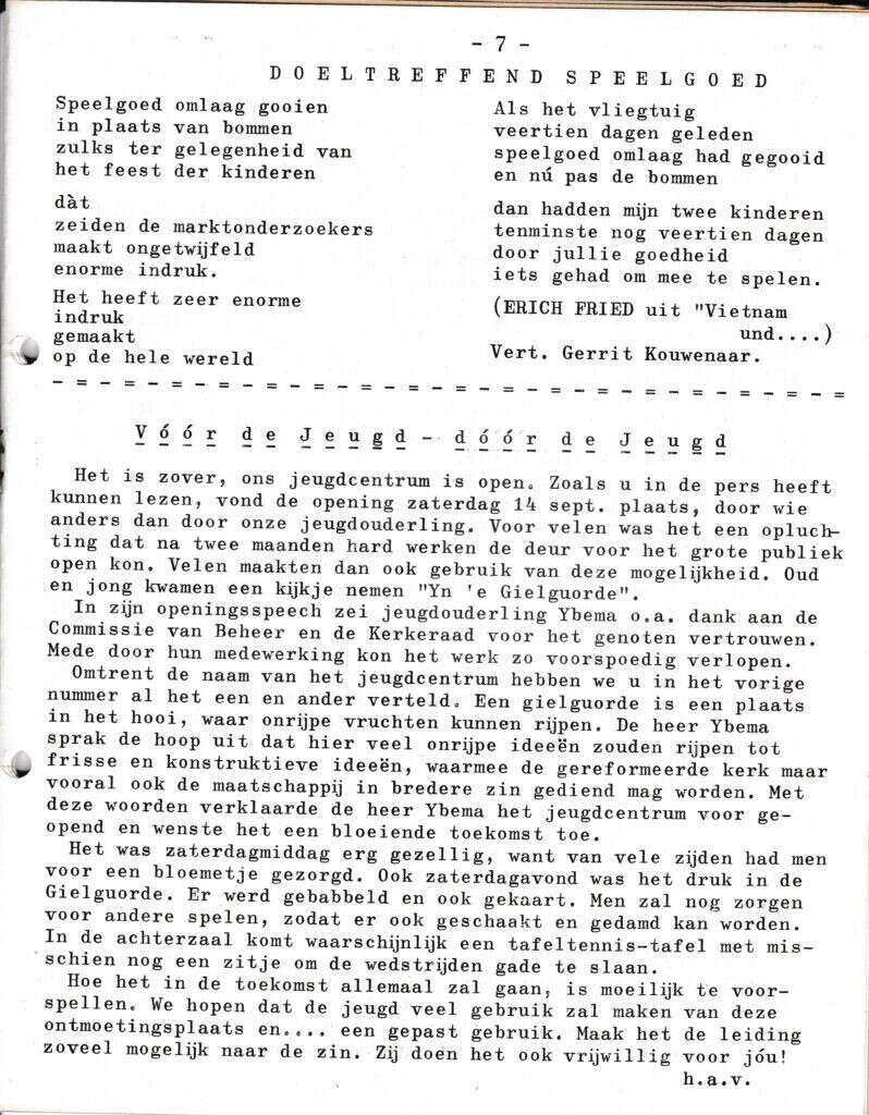 | Beschrijving: | It Fleurige Flittergat: 1968 5ste jaargang nr. 2: Doeltreffend speelgoed : (Erich Fried over Vietnam). opening Bar "Yn'e Gielguorde" |