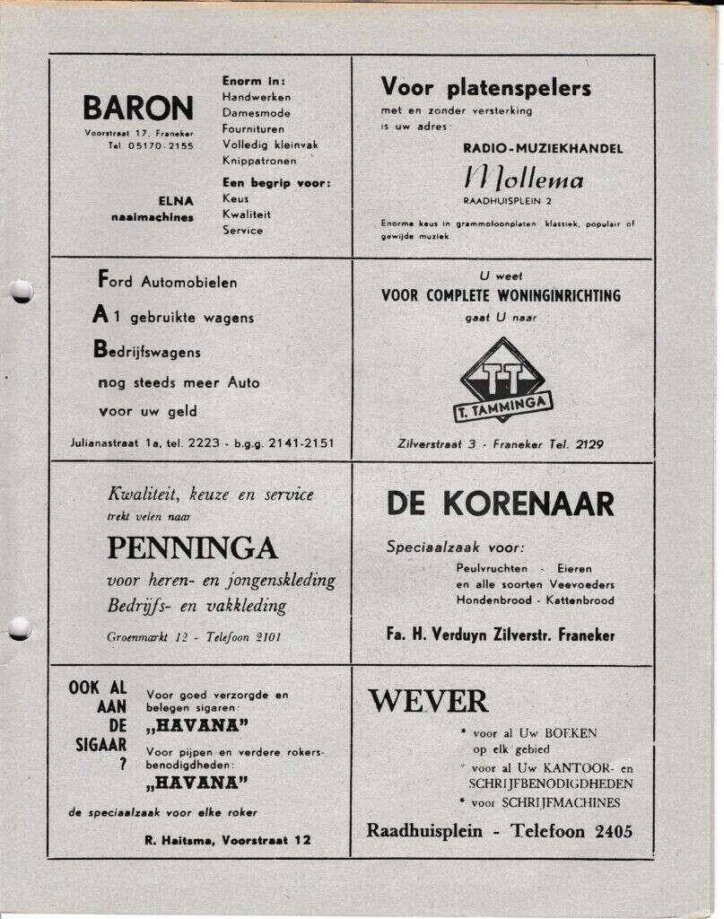 | Beschrijving: | It Fleurige Flittergat: 1968 5ste jaargang nr. 2: Reklame; Baron naaimachines Voorstraat 17, Radio-muziekhandel Mollema Raadhuisplein 2 , F.A.B Julianastraat 1, Woninginrichting T.Tamminga Zilverstraat 3, Herenmode Penninga Groenmarkt 12, De Korenaar, zilverstraat 58, Sigarenmagazijn"Havana" K.Sijtsma Voorstraat 12, Boekhandel Wever Raadhuisplein 4 |