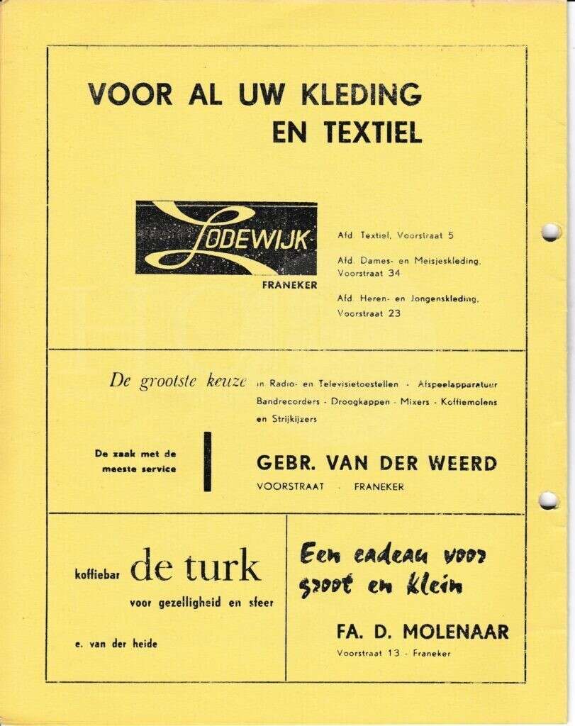| Beschrijving: | It Fleurige Flittergat: 1968 5ste jaargang nr. 4: Reklame; Lodewijk Textiel en kleding Voorstraat 5,23 en 34, Gebr. Van der Weert Voorstraat 25, Koffiebar De Turk, Fa.D.Molenaar Voorstaat 13 |
