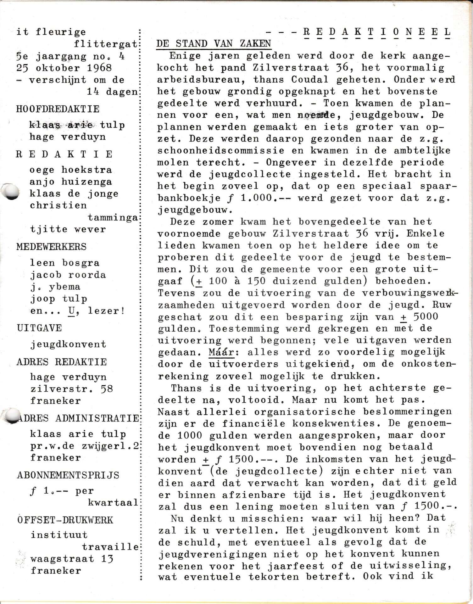 Beschrijving:It Fleurige Flittergat: 1968 5ste jaargang nr. 4: Stand van zaken Zilverstraat 36: jeugdconvent in de schulden.