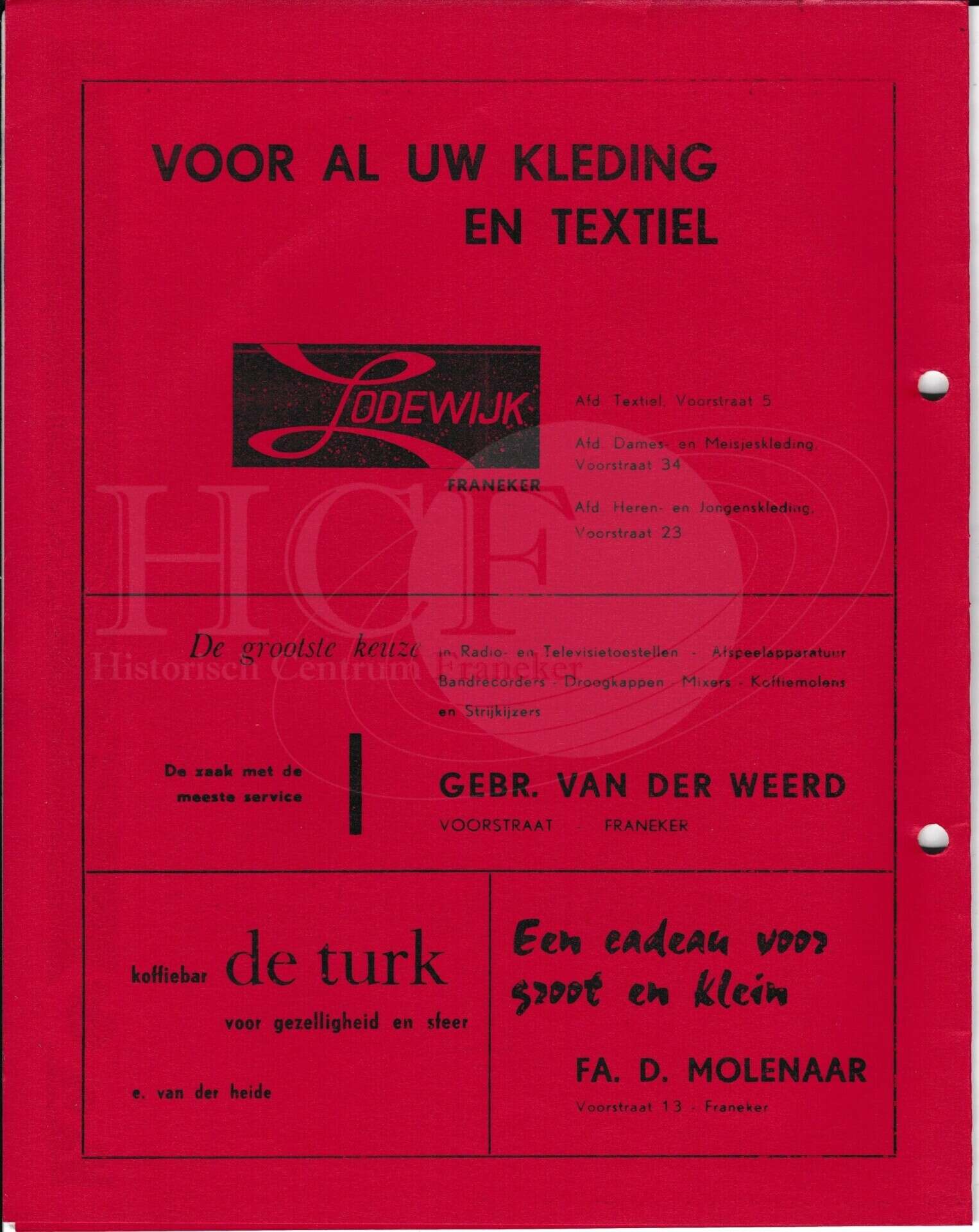 Beschrijving:It Fleurige Flittergat: 1968 5ste jaargang nr. 5: Reklame; Lodewijk Textiel en kleding Voorstraat 5,23 en 34, Gebr. Van der Weert Voorstraat 25, Koffiebar De Turk, Fa.D.Molenaar Voorstaat 13