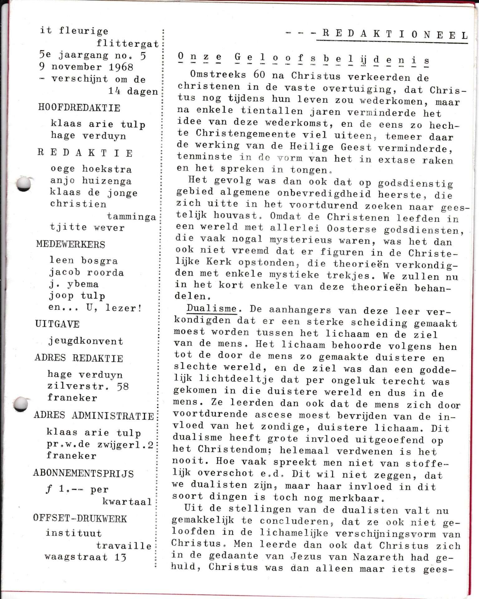 Beschrijving:It Fleurige Flittergat: 1968 5ste jaargang nr. 5: Redactioneel: Onze geloofsbelijdenis