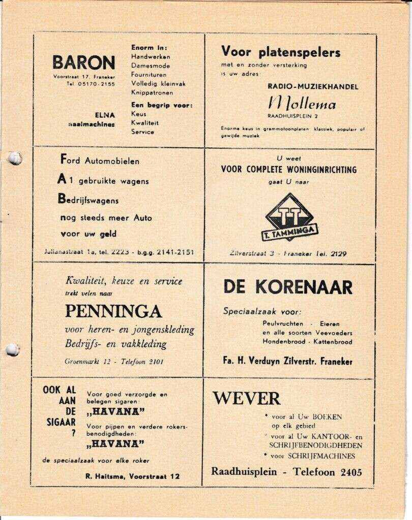 Beschrijving:It Fleurige Flittergat: 1968 5ste jaargang nr. 6: Reklame; Baron naaimachines Voorstraat 17, Radio-muziekhandel Mollema Raadhuisplein 2 , F.A.B Julianastraat 1, Woninginrichting T.Tamminga Zilverstraat 3, Herenmode Penninga Groenmarkt 12, De Korenaar, zilverstraat 58, Sigarenmagazijn"Havana" K.Sijtsma Voorstraat 12, Boekhandel Wever Raadhuisplein 4