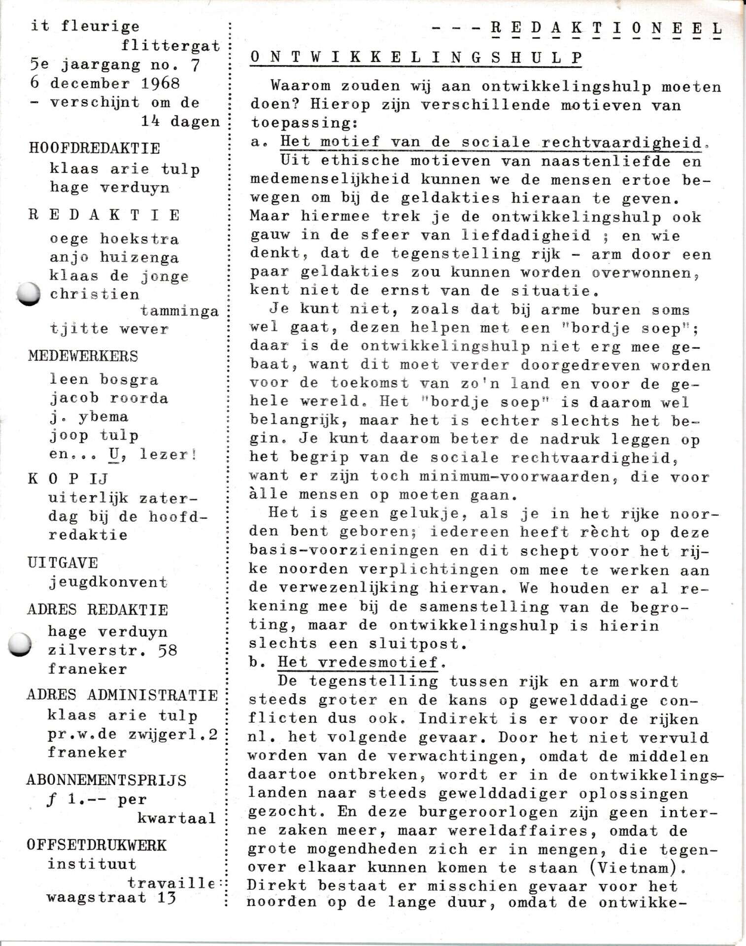 Beschrijving:It Fleurige Flittergat: 1968 5ste jaargang nr. 7: Redactioneel: Ontwikkelingshulp