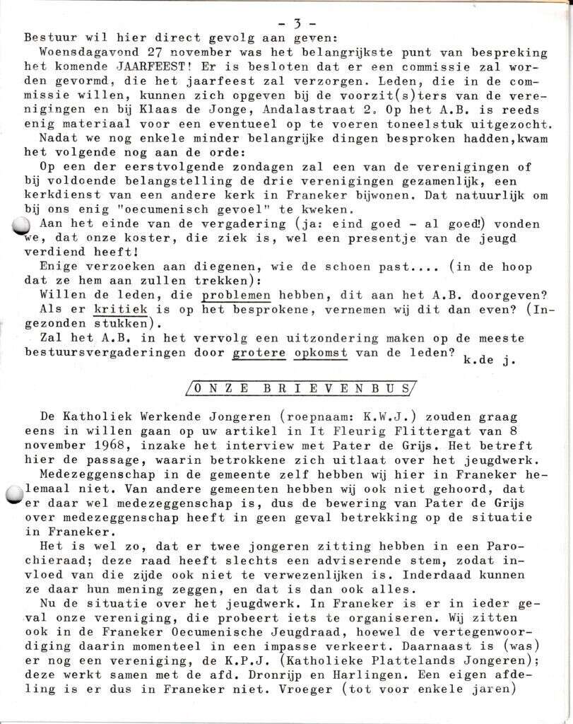 | Beschrijving: | It Fleurige Flittergat: 1968 5ste jaargang nr. 7: vervolg Algemene bestuursvergadering. Onze breivenbus: reactie op Pater de Grijs |