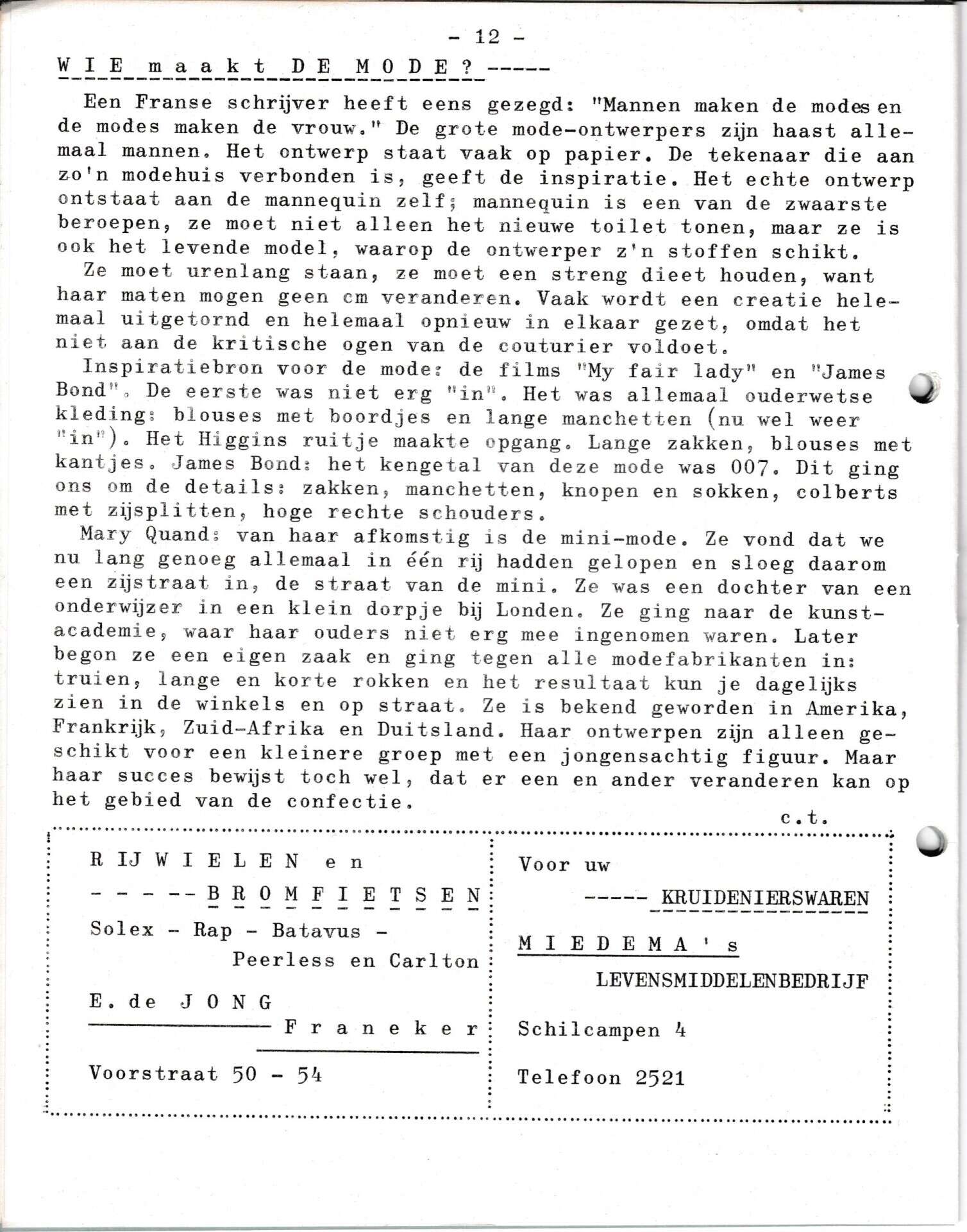 | Beschrijving: | It Fleurige Flittergat: 1968 5ste jaargang nr. 7: Wie maakt de mode? Reklame; E.de Jong rijwielen en bromfietsen Voorstraat 50-54, Miedema Kruidenier Schilcampen 4. |