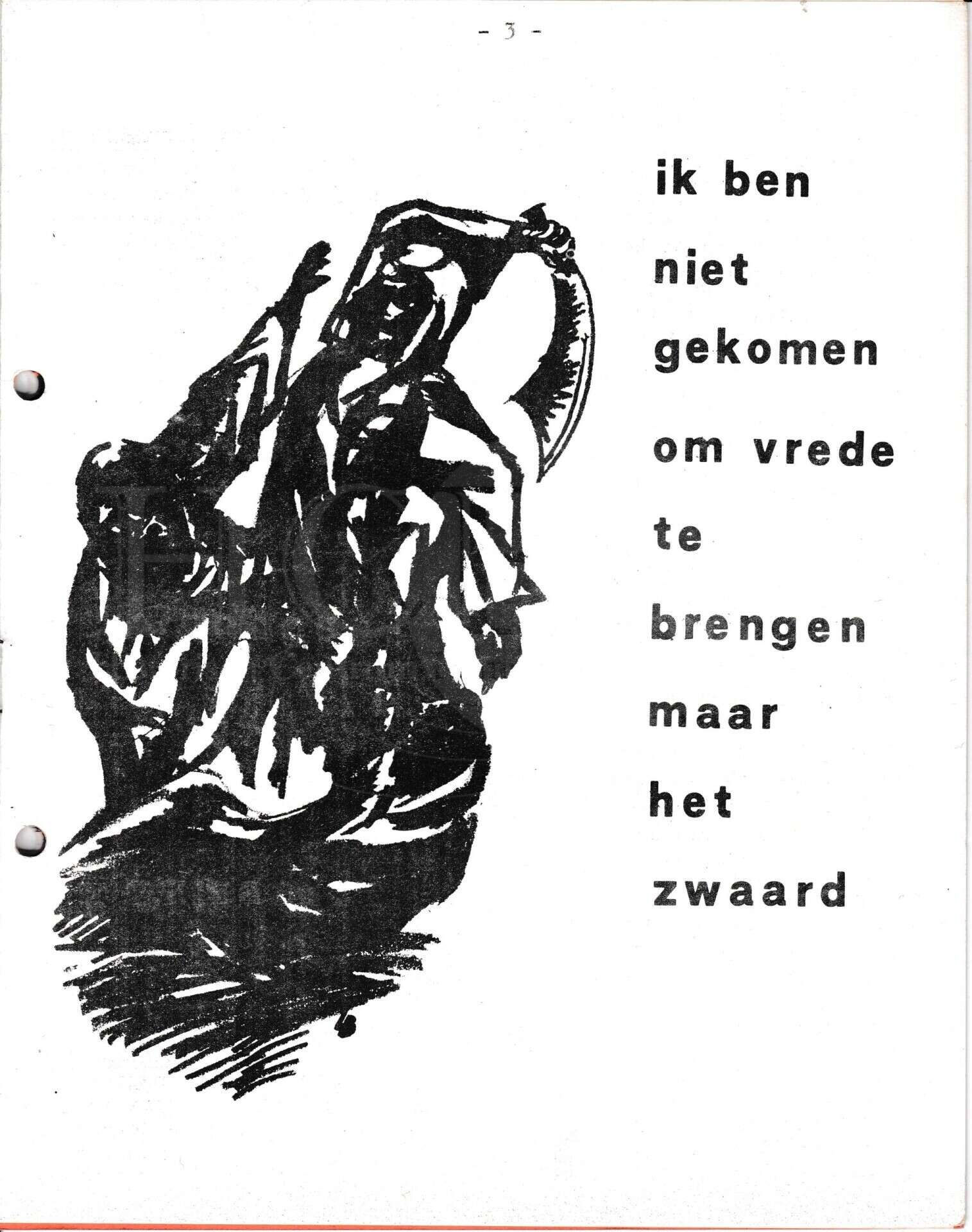 | Beschrijving: | It Fleurige Flittergat: 1968 5ste jaargang nr. 8: Ik ben gekomen om vrede te brengen, maar het zwaard (Matteüs 10:34-39) |