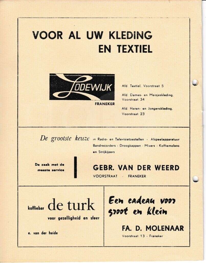 | Beschrijving: | It Fleurige Flittergat: 1969 5ste jaargang nr. 9: Reklame; Lodewijk Textiel en kleding Voorstraat 5,23 en 34, Gebr. Van der Weert Voorstraat 25, Koffiebar De Turk, Fa.D.Molenaar Voorstaat 13 |