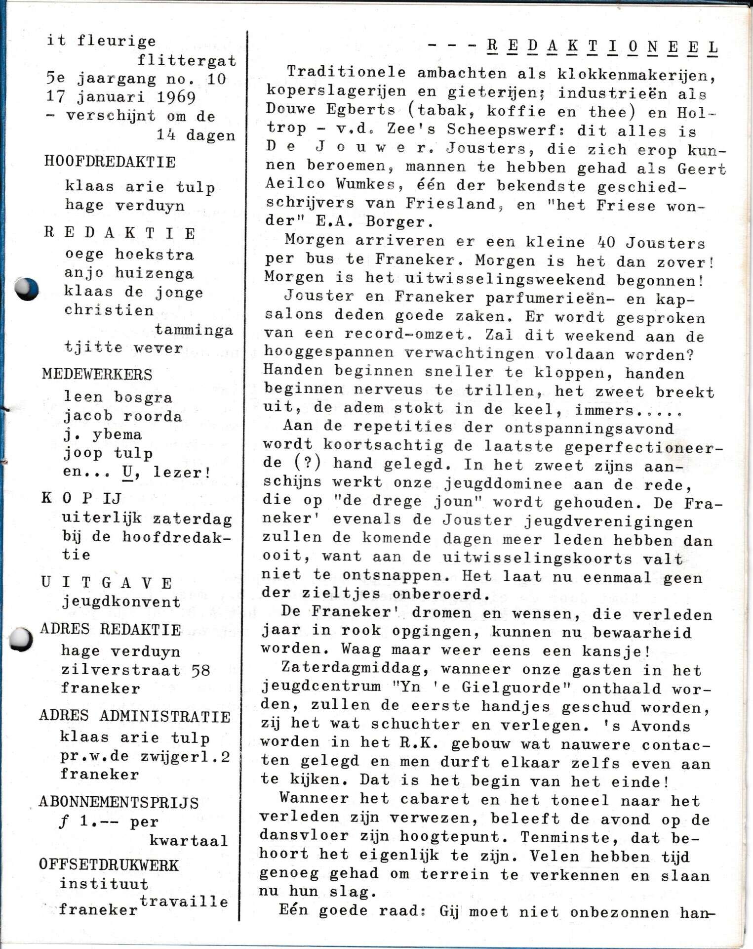| Beschrijving: | It Fleurige Flittergat: 1969 5ste jaargang nr. 10: Redactioneel: Uitwisseling: Joure |
