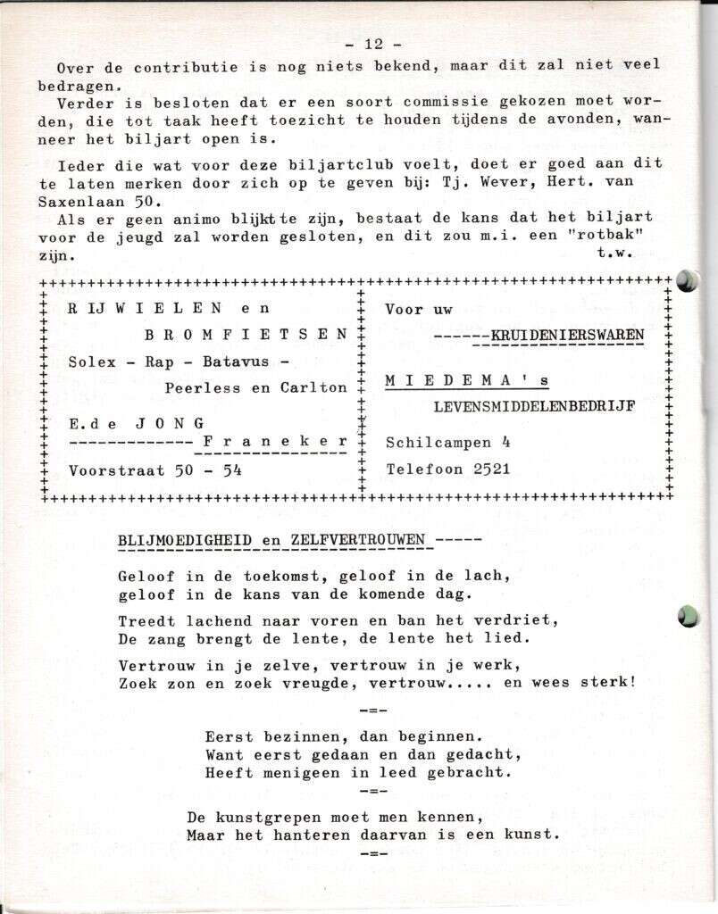 | Beschrijving: | It Fleurige Flittergat: 1969 5ste jaargang nr. 11: vervolg Biljardclub. Reklame; E.de Jong rijwielen en bromfietsen Voorstraat 50-54, Miedema Kruidenier Schilcampen 4. gedicht blijmoedigheid en zelfvertrouwen. |