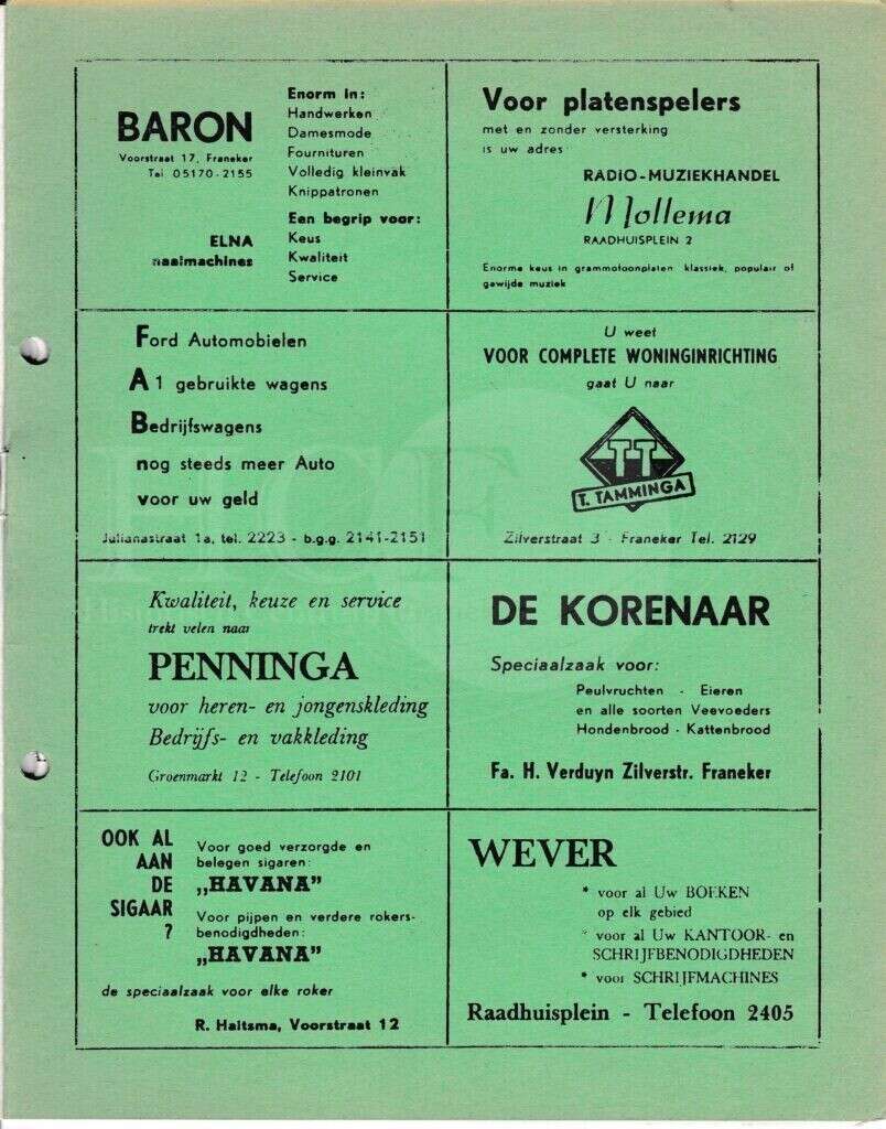 | Beschrijving: | It Fleurige Flittergat: 1969 5ste jaargang nr. 11: Reklame; Baron naaimachines Voorstraat 17, Radio-muziekhandel Mollema Raadhuisplein 2 , F.A.B Julianastraat 1, Woninginrichting T.Tamminga Zilverstraat 3, Herenmode Penninga Groenmarkt 12, De Korenaar, zilverstraat 58, Sigarenmagazijn"Havana" K.Sijtsma Voorstraat 12, Boekhandel Wever Raadhuisplein 4 |