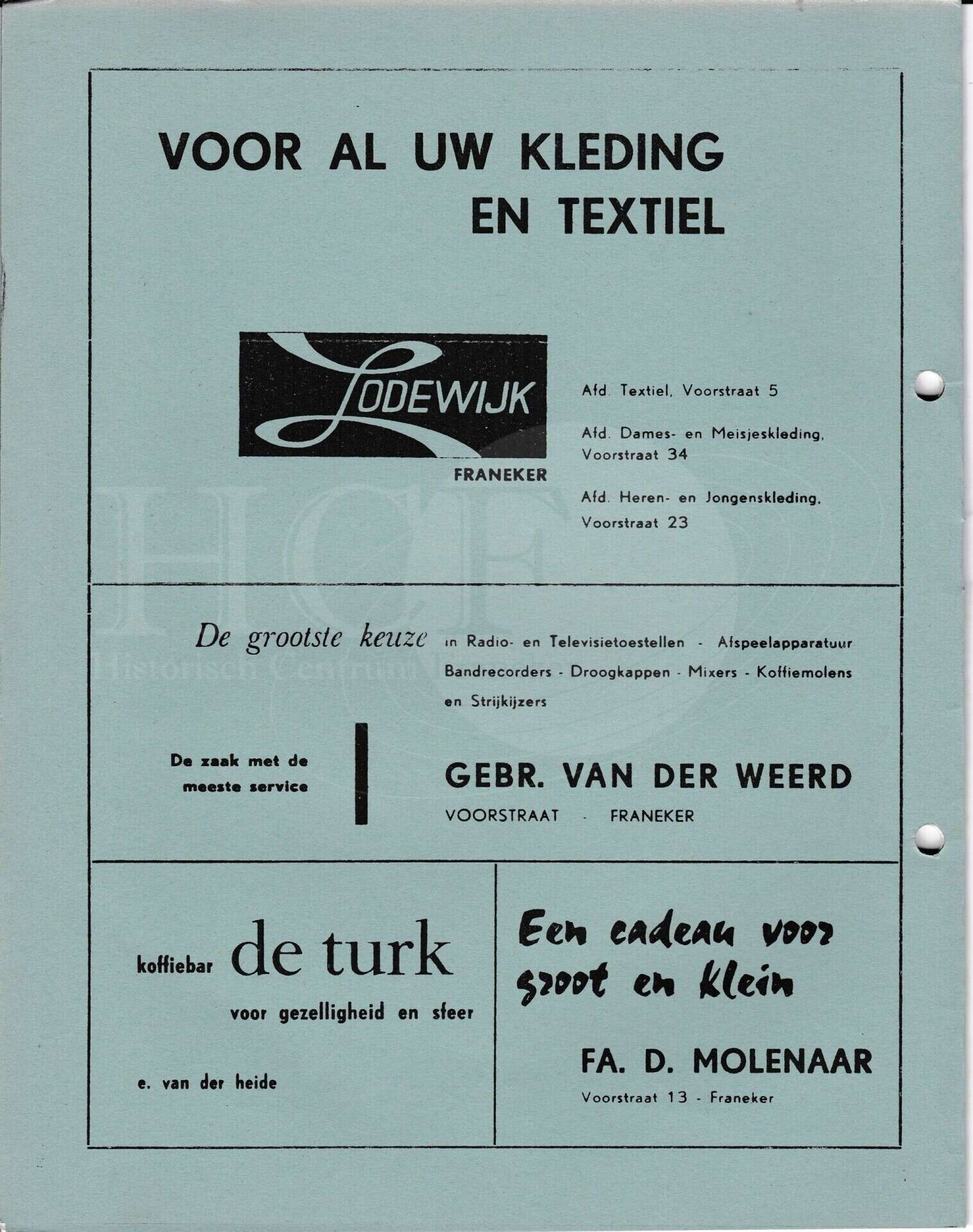 | Beschrijving: | It Fleurige Flittergat: 1969 5ste jaargang nr. 12: Reklame; Lodewijk Textiel en kleding Voorstraat 5,23 en 34, Gebr. Van der Weert Voorstraat 25, Koffiebar De Turk, Fa.D.Molenaar Voorstaat 13 |