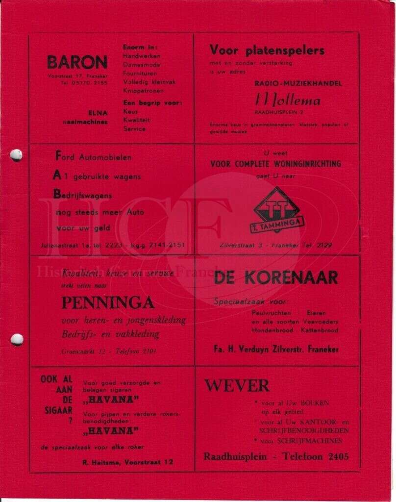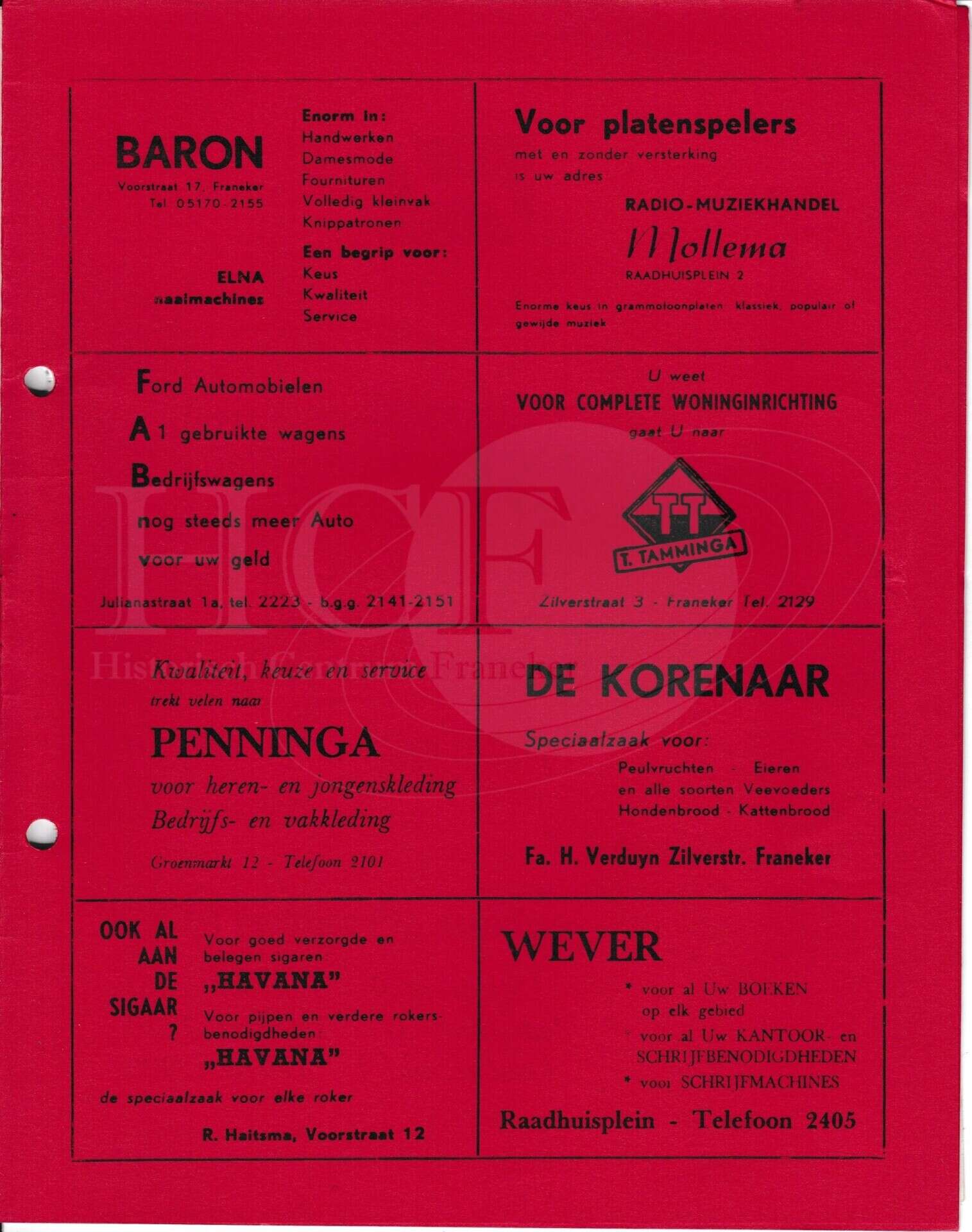 Beschrijving:It Fleurige Flittergat: 1969 5de jaargang nr. 13: Reklame; Baron naaimachines Voorstraat 17, Radio-muziekhandel Mollema Raadhuisplein 2 , F.A.B Julianastraat 1, Woninginrichting T.Tamminga Zilverstraat 3, Herenmode Penninga Groenmarkt 12, De Korenaar, zilverstraat 58, Sigarenmagazijn"Havana" K.Sijtsma Voorstraat 12, Boekhandel Wever Raadhuisplein 4