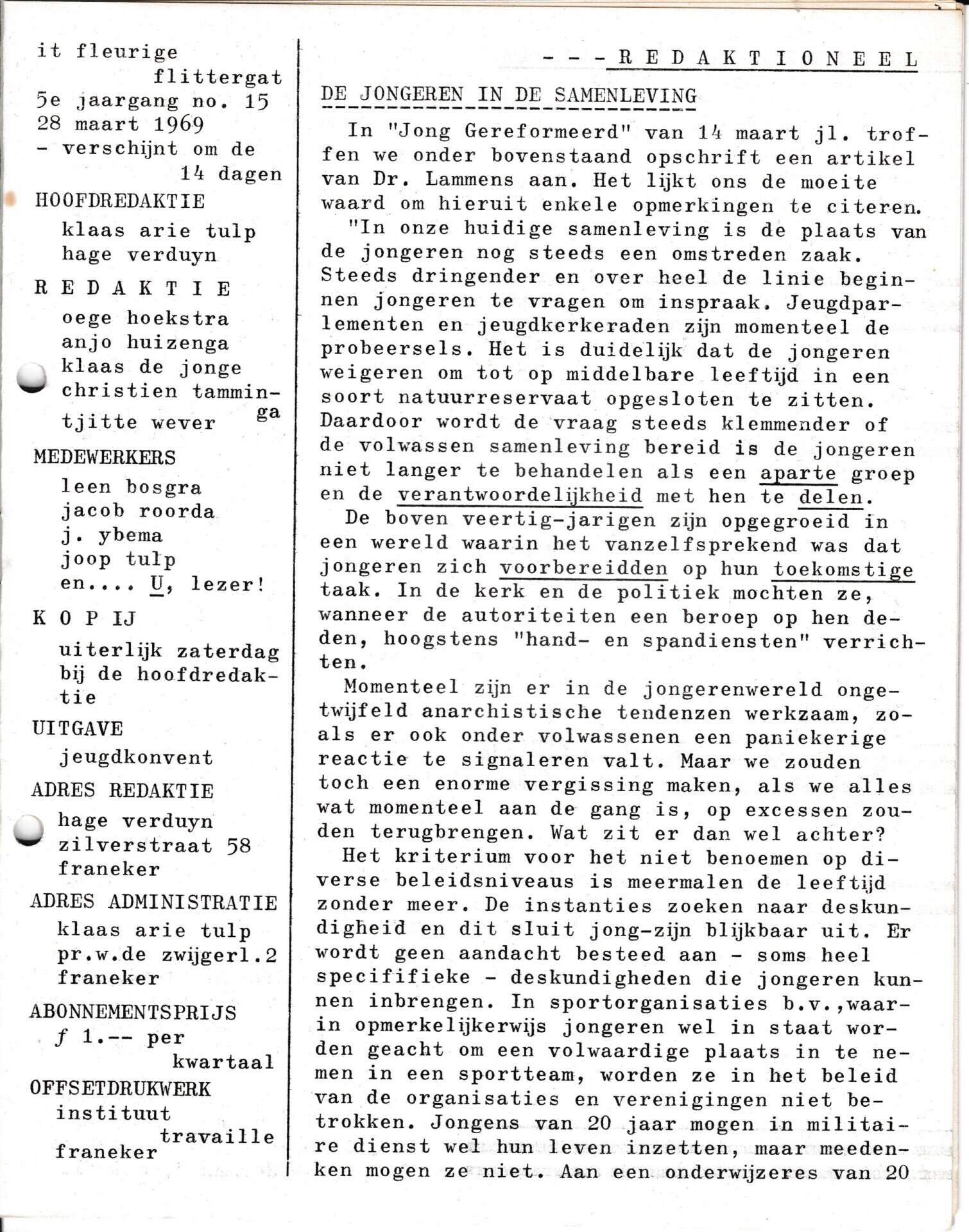 | Beschrijving: | It Fleurige Flittergat: 1969 5de jaargang nr. 15: Redactioneel: De jongeren in de samenleving. |