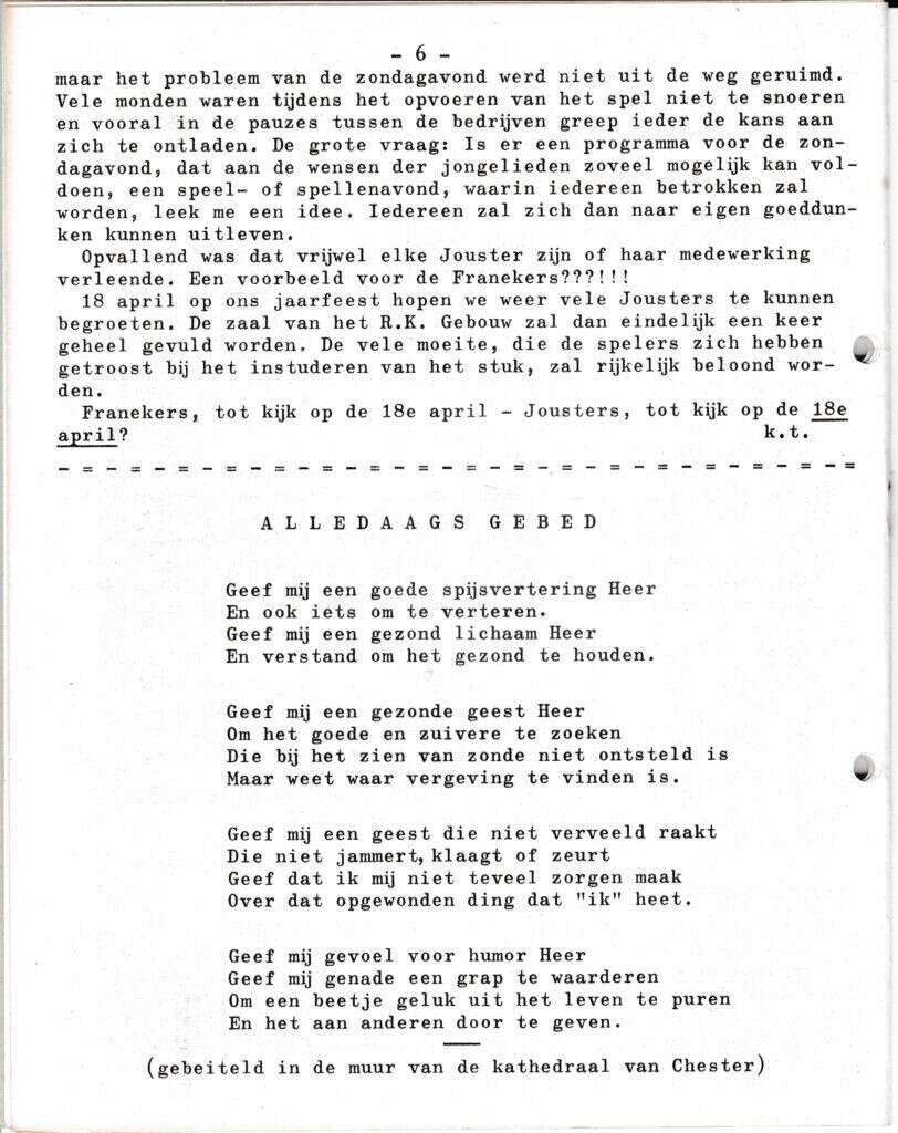 Beschrijving:It Fleurige Flittergat: 1969 5de jaargang nr. 15: vervolg Uitwisseling Joure (Verslag). Alledaags gebed (gebeiteld in muur van de kathadraal van Chester)