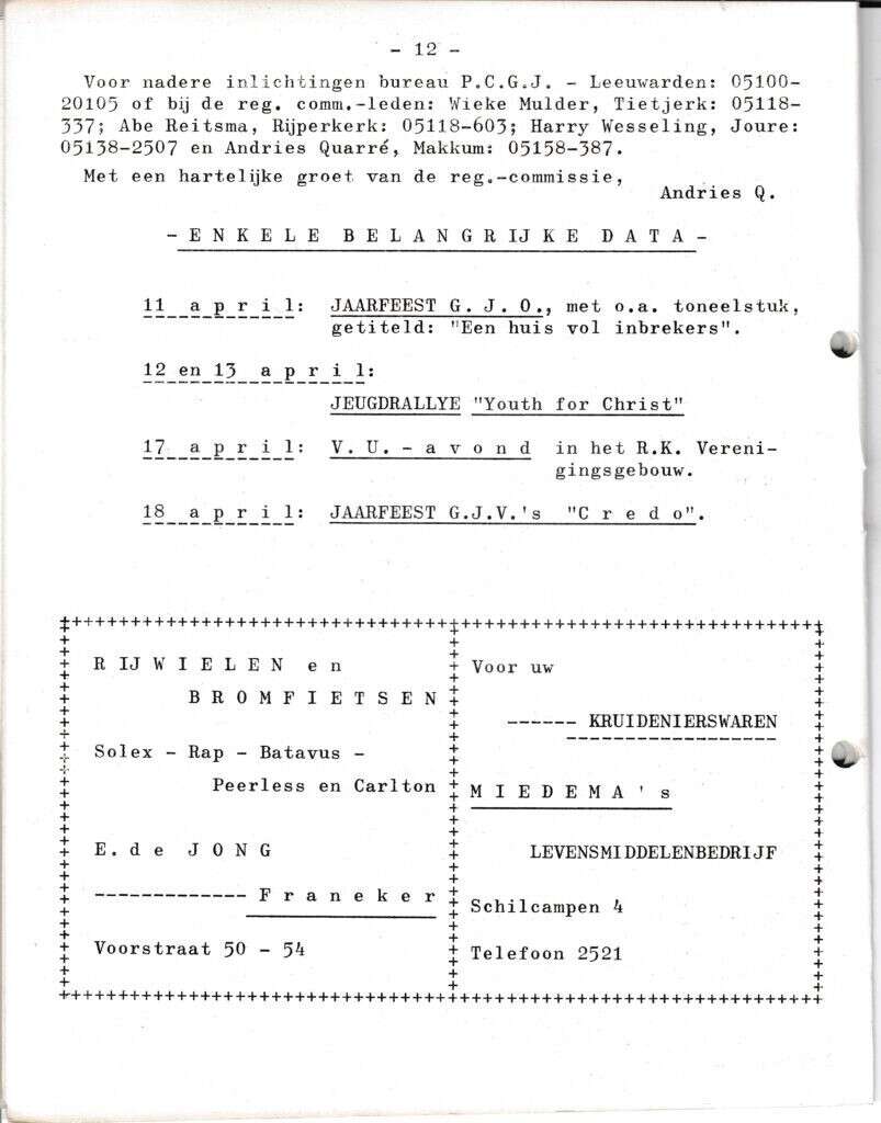 Beschrijving:It Fleurige Flittergat: 1969 5de jaargang nr. 15: vervolg Paasmeeting in Leeuwarden. Agenda. Reklame; E.de Jong rijwielen en bromfietsen Voorstraat 50-54, Miedema Kruidenier Schilcampen 4