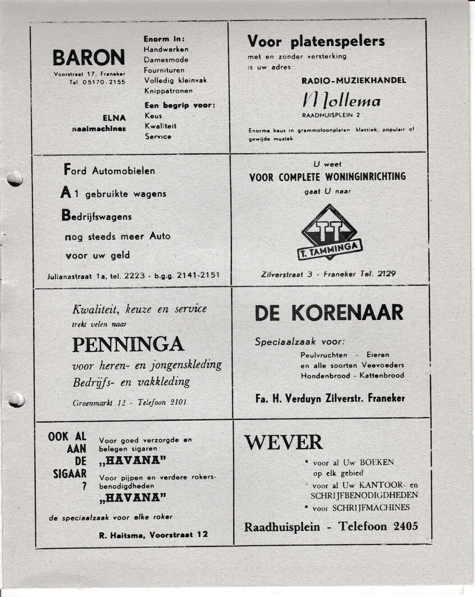| Beschrijving: | It Fleurige Flittergat: 1969 5de jaargang nr. 15: Reklame; Baron naaimachines Voorstraat 17, Radio-muziekhandel Mollema Raadhuisplein 2 , F.A.B Julianastraat 1, Woninginrichting T.Tamminga Zilverstraat 3, Herenmode Penninga Groenmarkt 12, De Korenaar, zilverstraat 58, Sigarenmagazijn"Havana" K.Sijtsma Voorstraat 12, Boekhandel Wever Raadhuisplein 4 |