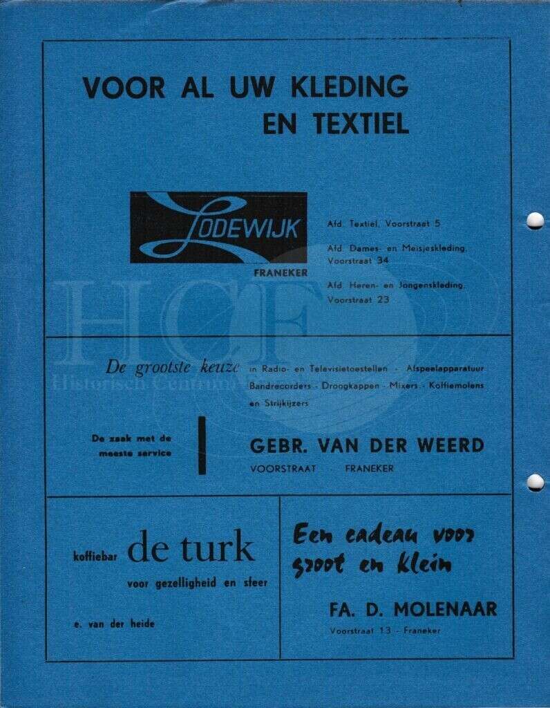 | Beschrijving: | It Fleurige Flittergat: 1969 5de jaargang nr. 16: Reklame; Lodewijk Textiel en kleding Voorstraat 5,23 en 34, Gebr. Van der Weert Voorstraat 25, Koffiebar De Turk, Fa.D. Molenaar Voorstaat 13 |