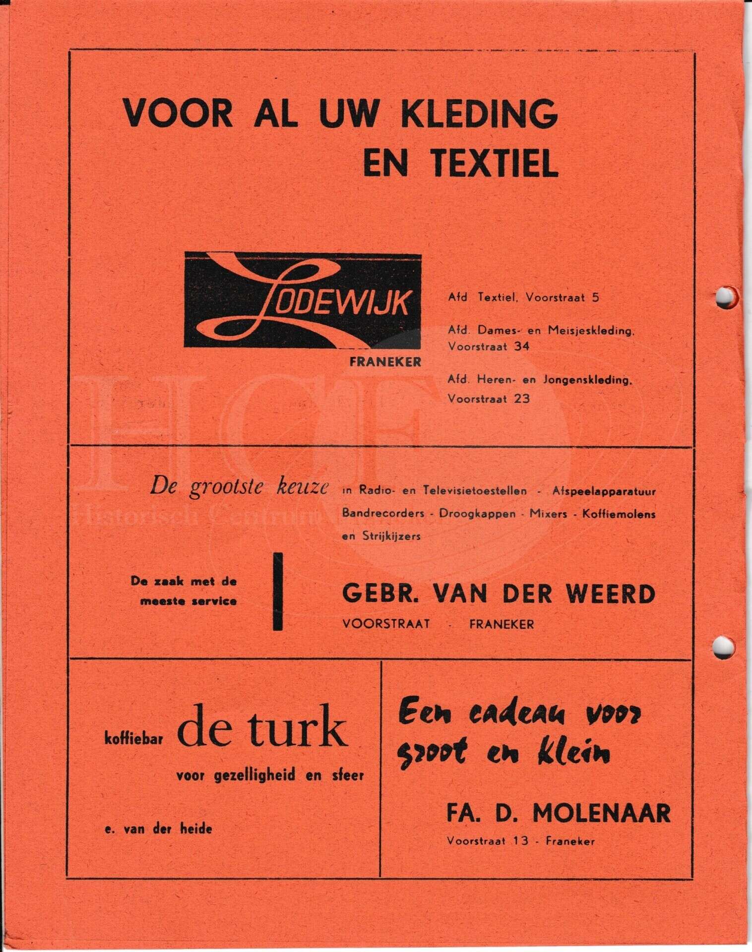 | Beschrijving: | It Fleurige Flittergat: 1969 5de jaargang nr. 17: Reklame; Lodewijk Textiel en kleding Voorstraat 5,23 en 34, Gebr. Van der Weert Voorstraat 25, Koffiebar De Turk, Fa.D. Molenaar Voorstaat 13 |