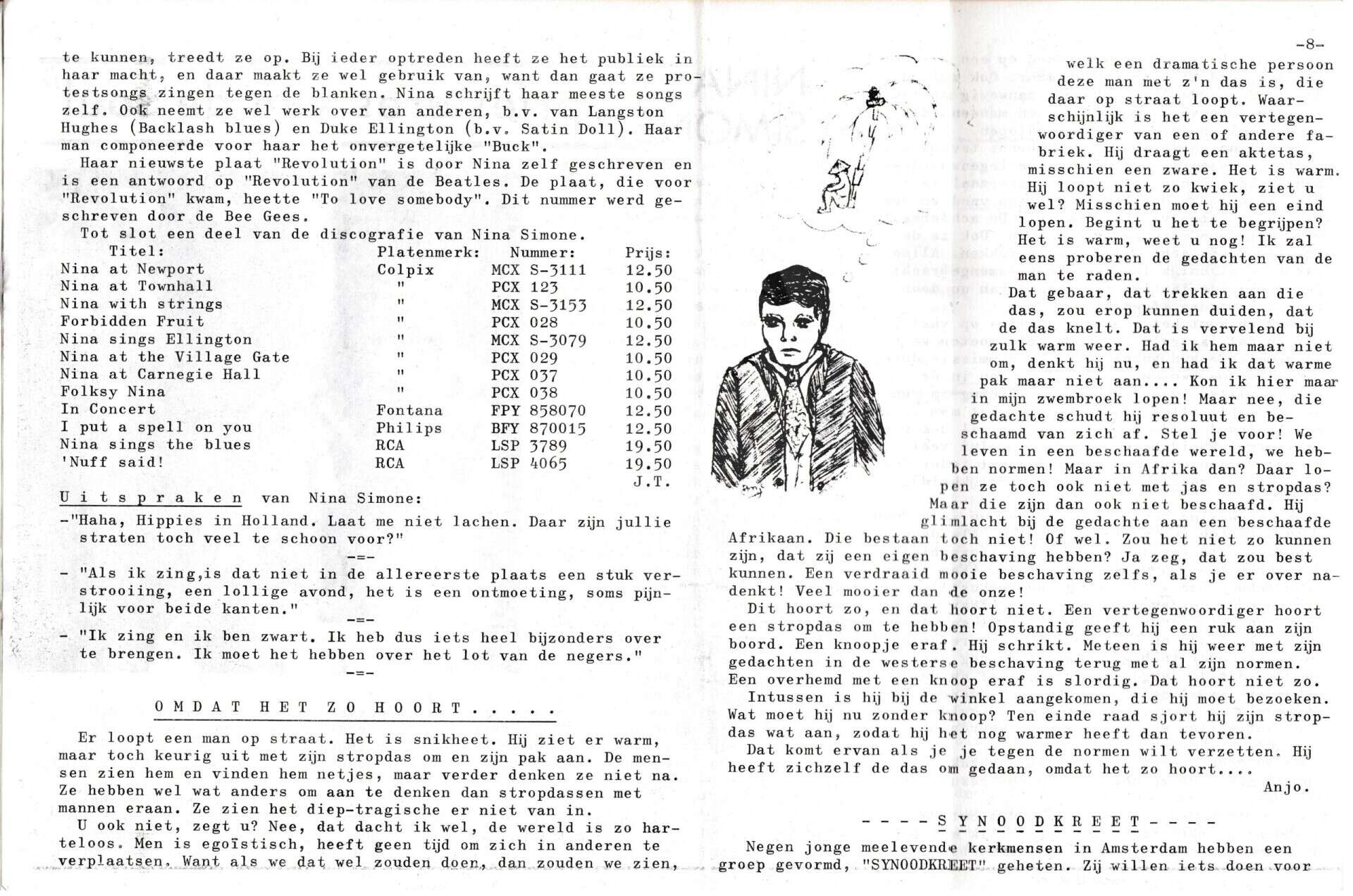 | Beschrijving: | It Fleurige Flittergat: 1969 5de jaargang nr. 19: vervolg Soosparade: Nina Simone 'Priesters van de Soul". Omdat het zo hoort… Synoodkreet. |