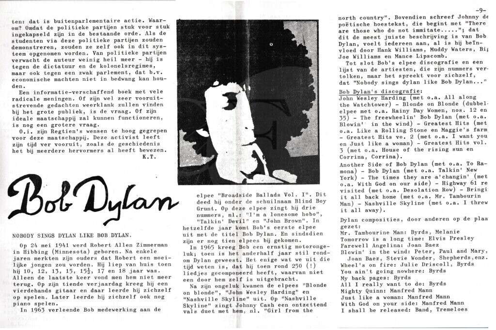 Beschrijving:It Fleurige Flittergat: 1969 5de jaargang nr. 20: vervolg Universiteit in opstand (Ton Regtien) Soosparade; Bob Dylan