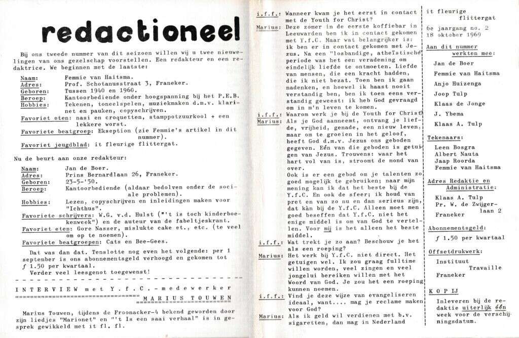 | Beschrijving: | It Fleurige Flittergat: 1969 6de jaargang nr. 2: Redactioneel: nieuwe redacteuren, interview met Youth For Christ mederwerker Marius Touwen. |