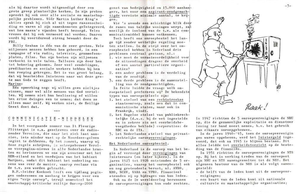 | Beschrijving: | It Fleurige Flittergat: 1969 6de jaargang nr. 2: vervolg interview met Youth For Christ mederwerker Marius Touwen. Communicatie middelen: de omroepen. |