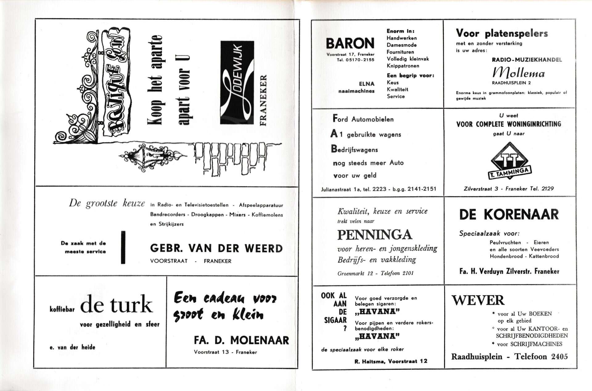 | Beschrijving: | It Fleurige Flittergat: 1969 6de jaargang nr. 2: Reklame; Lodewijk Textiel en kleding Voorstraat 5,23 en 34, Gebr. Van der Weert Voorstraat 25, Koffiebar De Turk, Fa.D. Molenaar Voorstaat 13, Baron naaimachines Voorstraat 17, Radio-muziekhandel Mollema Raadhuisplein 2 , F.A.B Julianastraat 1, Woninginrichting T.Tamminga Zilverstraat 3, Herenmode Penninga Groenmarkt 12, De Korenaar, zilverstraat 58, Sigarenmagazijn"Havana" K.Sijtsma Voorstraat 12, Boekhandel Wever Raadhuisplein 4 |
