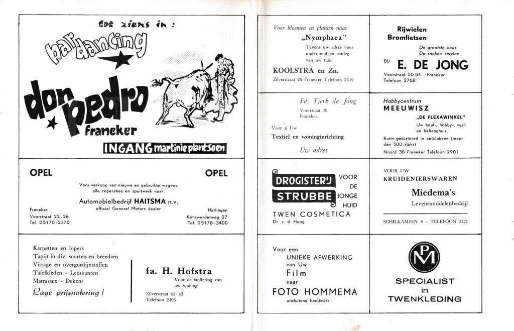 | Beschrijving: | It Fleurige Flittergat: 1969 6de jaargang nr. 2: Reklame: Don Pedro Martinplantsoen, Automobielbedrijf Haitsma Voorstraat 20-22, fa. H.Hofstra huis stoffeering Zilverstraat 41,43, Bloemenhuis "Nymphaea" Zilverstraat 26 , E. de Jong Rijwielen Voorstraat 50-54, Woninginrichting Tjerk de Jong Voorstraat 30, de Flexawinkel Noord 38, Droogisterij Strubbe Noord, Miedema's levensmiddelen Schilcampen 4, Foto Hommema Zilverstraat 1, PM Breedeplaats 12. |