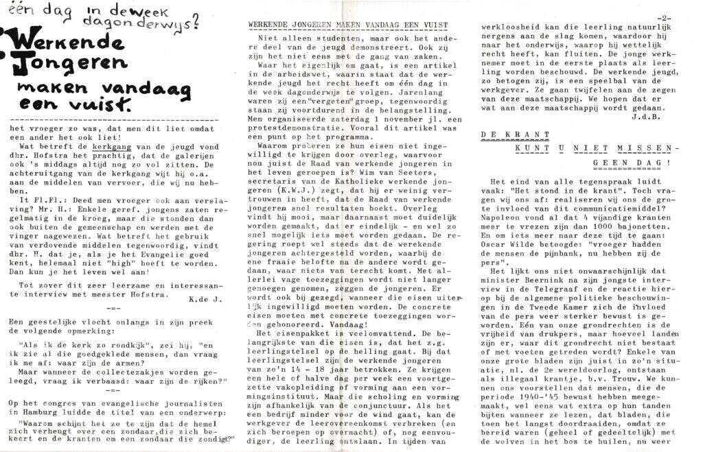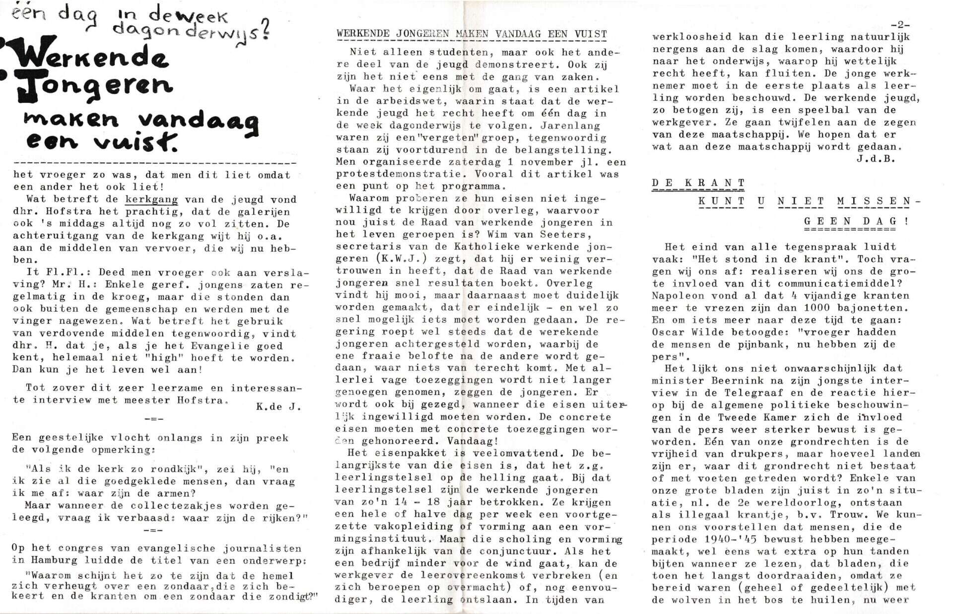 Beschrijving:It Fleurige Flittergat: 1969 6de jaargang nr. 3: vervolg De jeugd in Franeker zoals zij vroeger was (Intervieuw met Meester Lammert Hofstra). Werkenden jongeren maken vandaag een vuist. De krant kunt u niet missen - geen dag!