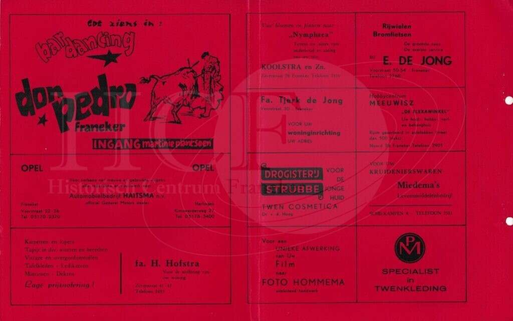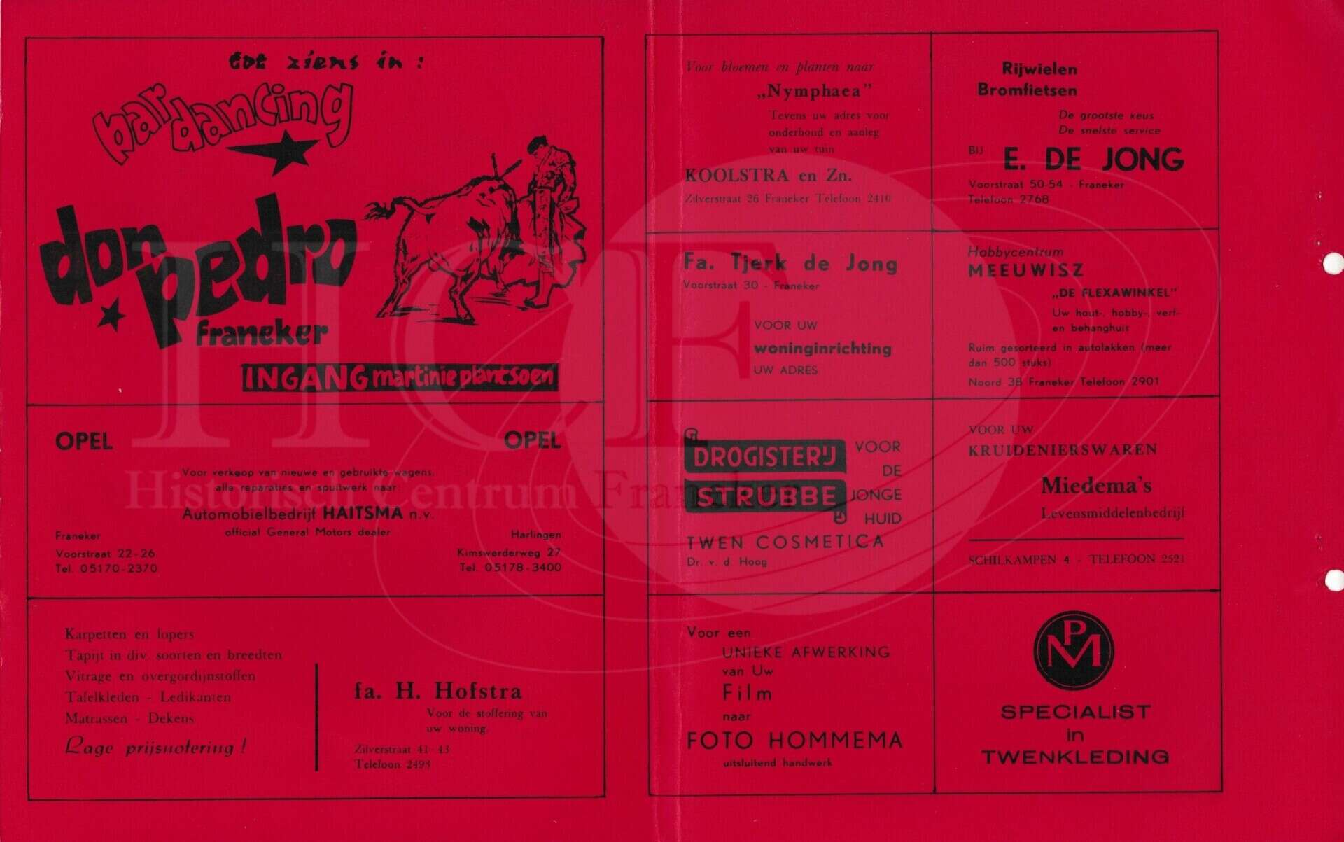 | Beschrijving: | It Fleurige Flittergat: 1969 6de jaargang nr. 3: Reklame: Don Pedro Martinplantsoen, Automobielbedrijf Haitsma Voorstraat 20-22, fa. H.Hofstra huis stoffeering Zilverstraat 41,43, Bloemenhuis "Nymphaea" Zilverstraat 26 , E. de Jong Rijwielen Voorstraat 50-54, Woninginrichting Tjerk de Jong Voorstraat 30, de Flexawinkel Noord 38, Droogisterij Strubbe Noord, Miedema's levensmiddelen Schilcampen 4, Foto Hommema Zilverstraat 1, PM Breedeplaats 12. |