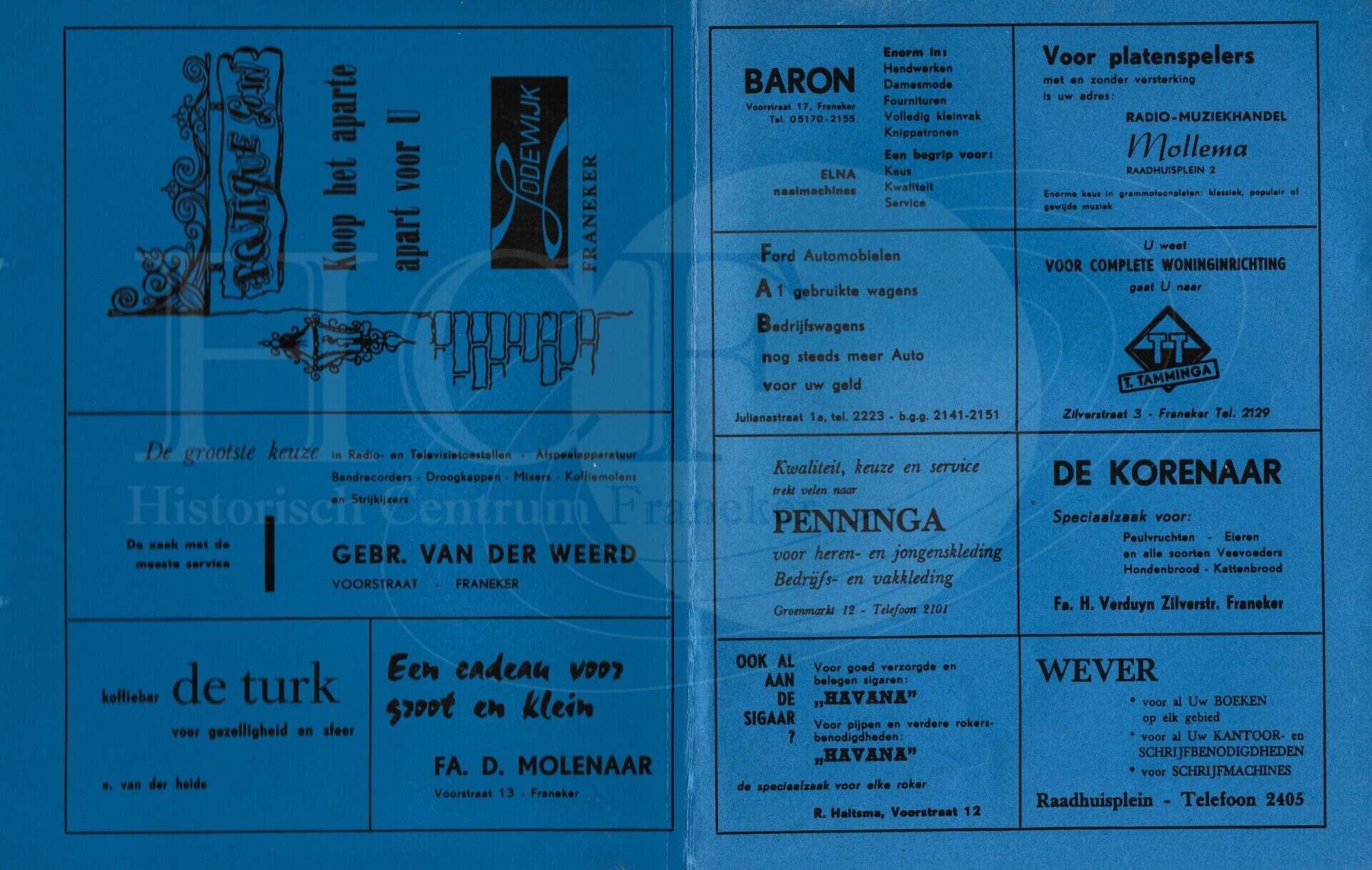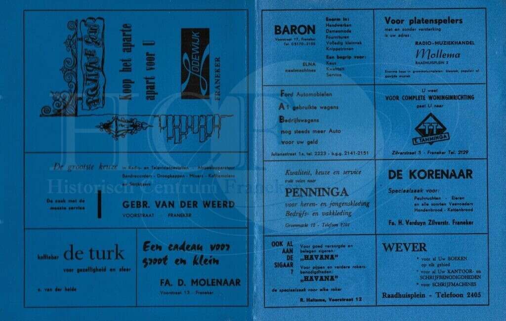 Beschrijving:It Fleurige Flittergat: 1969 6de jaargang nr. 4: Reklame; Lodewijk Textiel en kleding Voorstraat 5,23 en 34, Gebr. Van der Weert Voorstraat 25, Koffiebar De Turk, Fa.D. Molenaar Voorstaat 13, Baron naaimachines Voorstraat 17, Radio-muziekhandel Mollema Raadhuisplein 2 , F.A.B Julianastraat 1, Woninginrichting T.Tamminga Zilverstraat 3, Herenmode Penninga Groenmarkt 12, De Korenaar, zilverstraat 58, Sigarenmagazijn"Havana" K.Sijtsma Voorstraat 12, Boekhandel Wever Raadhuisplein 4