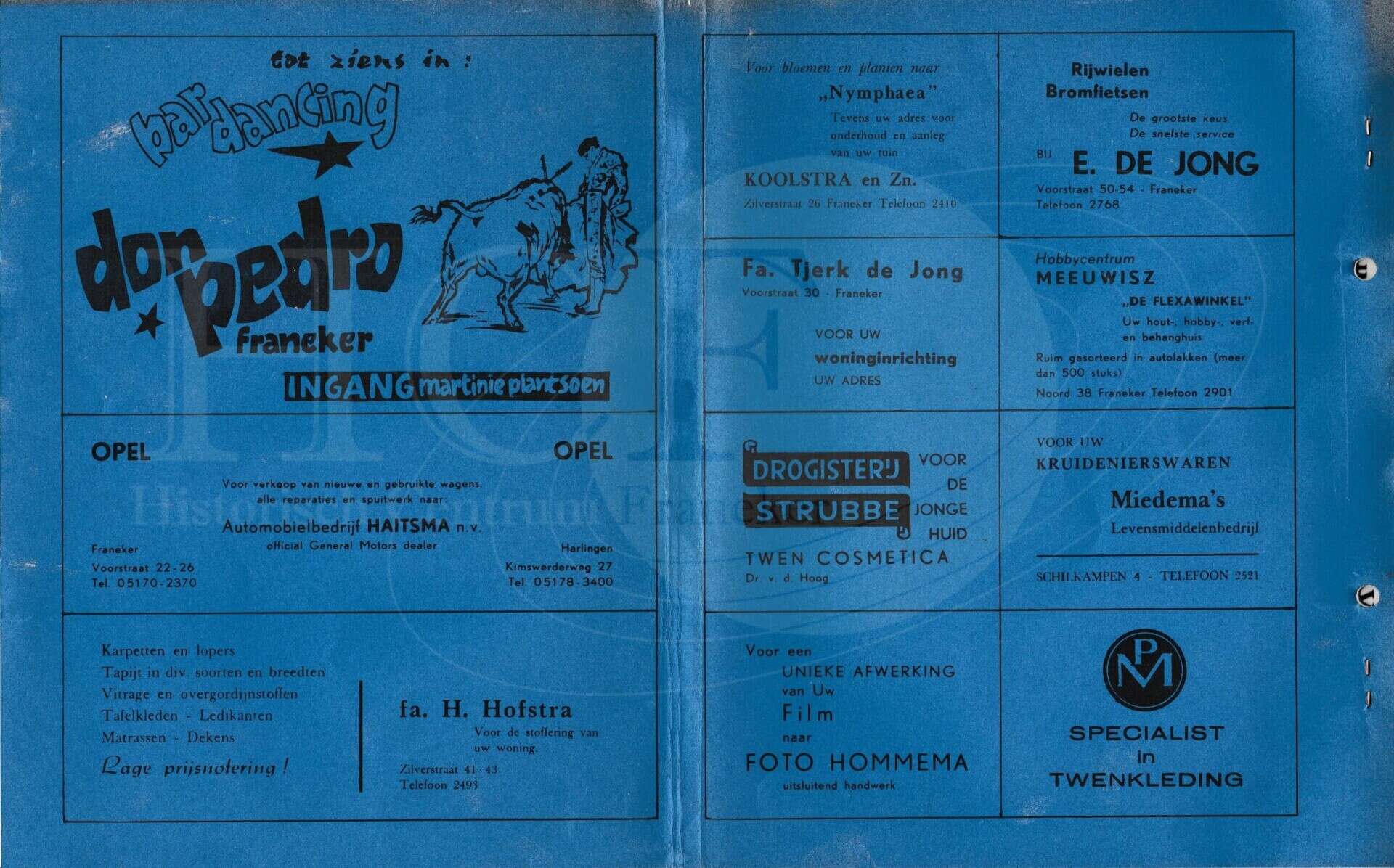 | Beschrijving: | It Fleurige Flittergat: 1969 6de jaargang nr. 4: Reklame: Don Pedro Martinplantsoen, Automobielbedrijf Haitsma Voorstraat 20-22, fa. H.Hofstra huis stoffeering Zilverstraat 41,43, Bloemenhuis "Nymphaea" Zilverstraat 26 , E. de Jong Rijwielen Voorstraat 50-54, Woninginrichting Tjerk de Jong Voorstraat 30, de Flexawinkel Noord 38, Droogisterij Strubbe Noord, Miedema's levensmiddelen Schilcampen 4, Foto Hommema Zilverstraat 1, PM Breedeplaats 12. |