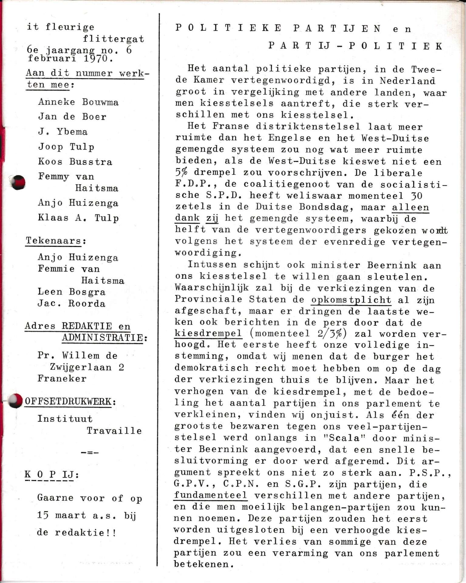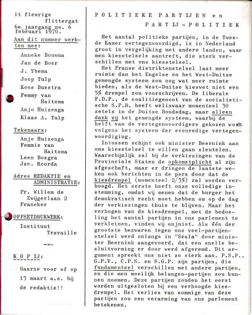 | Beschrijving: | It Fleurige Flittergat: 1970 6de jaargang nr. 6: Politieke parijen en partij politiek. |