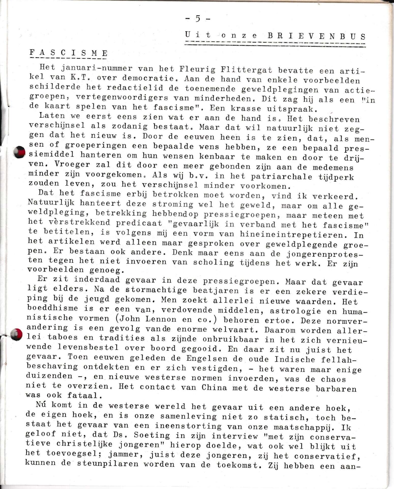 Beschrijving:It Fleurige Flittergat: 1970 6de jaargang nr. 6: Uit onze brievenbus: Democratie en Fascisme