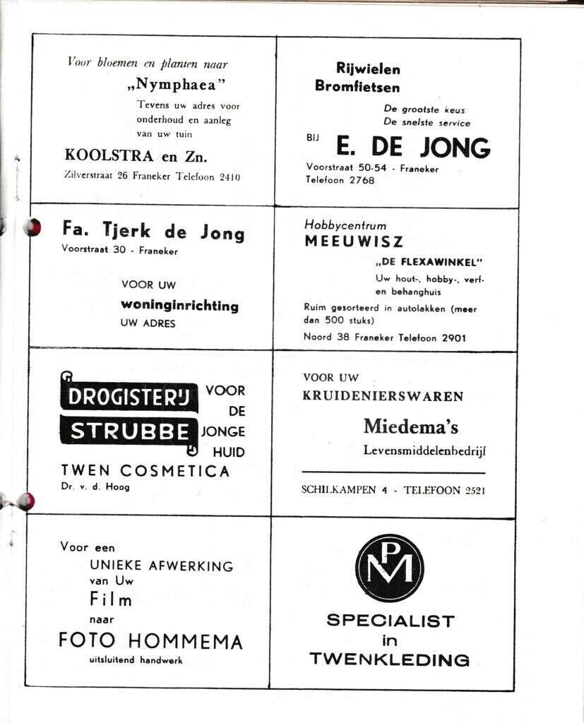 Beschrijving:It Fleurige Flittergat: 1970 6de jaargang nr. 6: Bloemenhuis "Nymphaea" Zilverstraat 26 , E. de Jong Rijwielen Voorstraat 50-54, Woninginrichting Tjerk de Jong Voorstraat 30, de Flexawinkel Noord 38, Droogisterij Strubbe Noord, Miedema's levensmiddelen Schilcampen 4, Foto Hommema Zilverstraat 1, PM Breedeplaats 12.