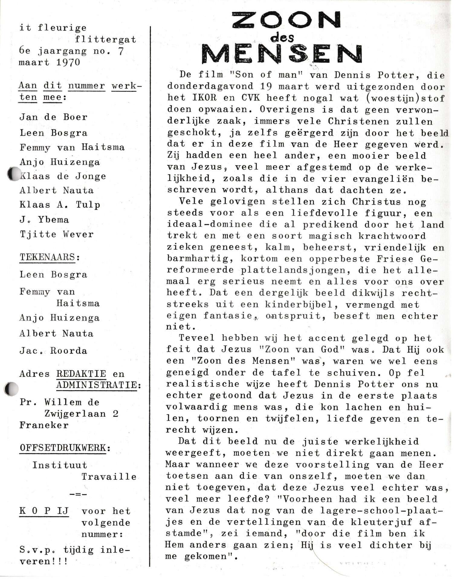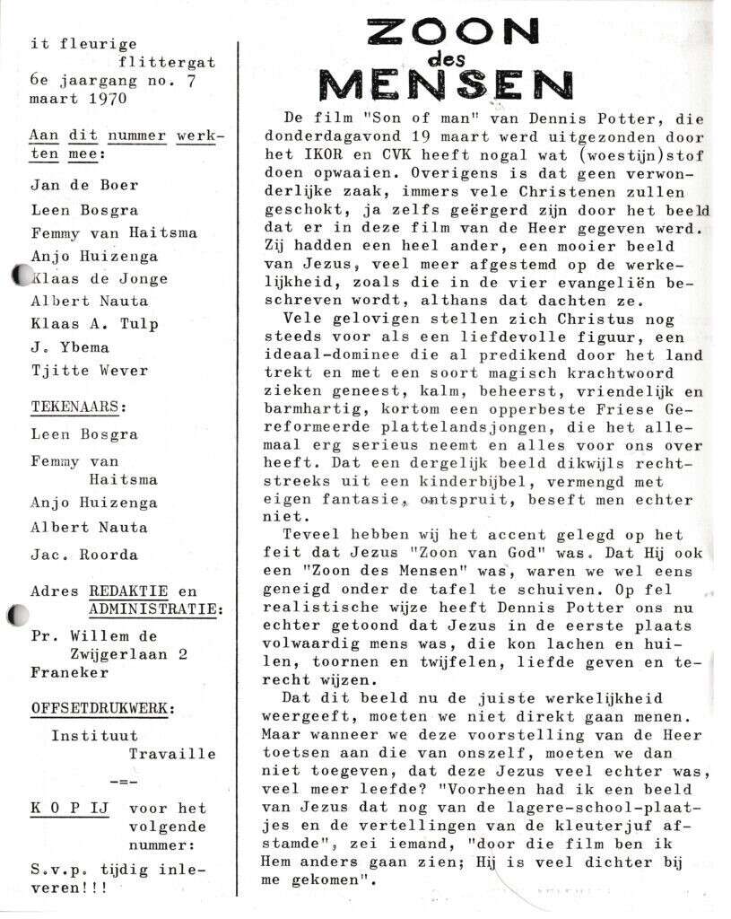 | Beschrijving: | It Fleurige Flittergat: 1970 6de jaargang nr. 7: "Son of Men" (Dennis Potter) |