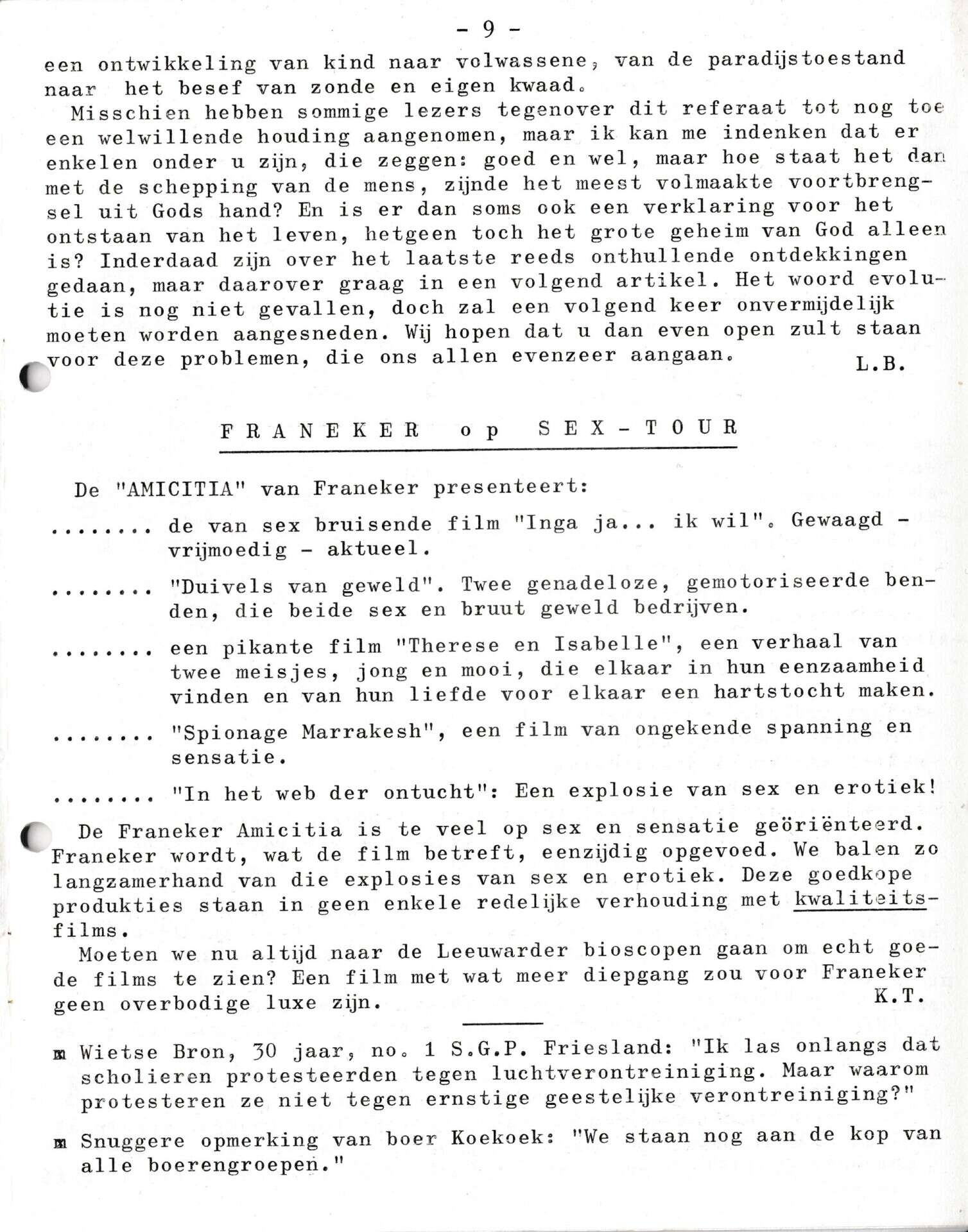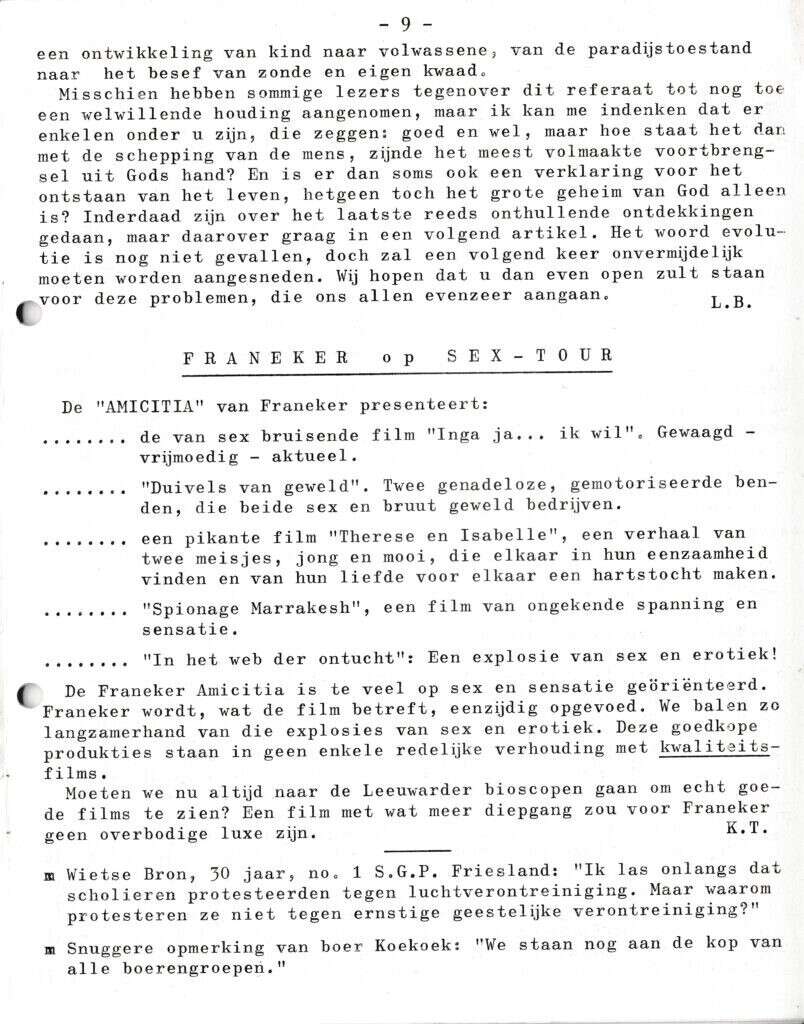| Beschrijving: | It Fleurige Flittergat: 1970 6de jaargang nr. 7: vervolg Over Apen gesproken (Evolutie theorie). Franeker op de seks - toer. |