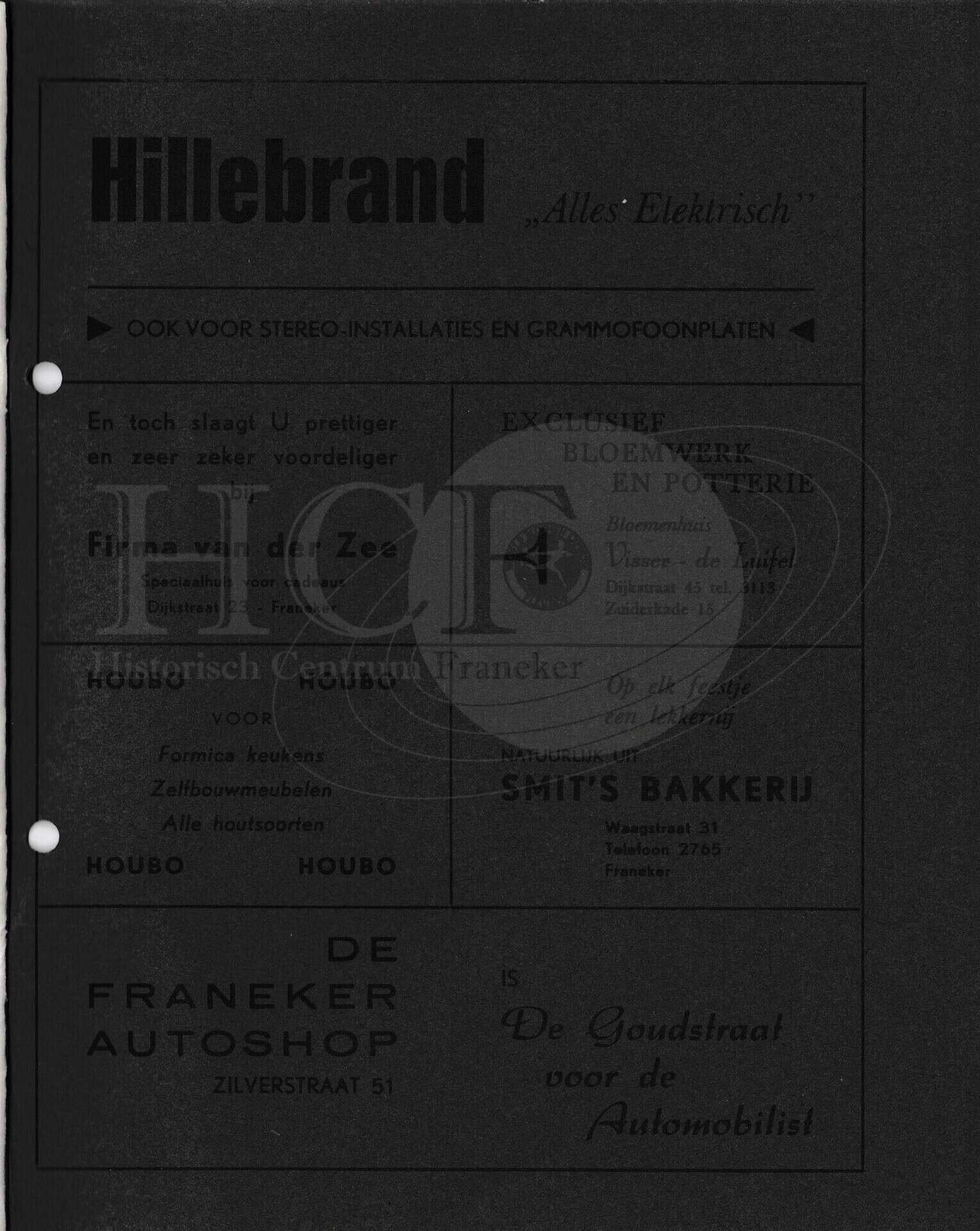 | Beschrijving: | It Fleurige Flittergat: 1970 6de jaargang nr. 7: Reklame: Hillebrand "Alles Electrisch" Dijkstraat 25, Firma Van der Zee cadeau's Dijkstraat 23, Bloemenhuis Visser-de Luifel Dijkstraat 45. HOUBO keueken en zelfbouw meubelen, Smid's Bakkerij Waagstraat 31, De Franeker autoshop Automaterialen Zilverstraat 51. |