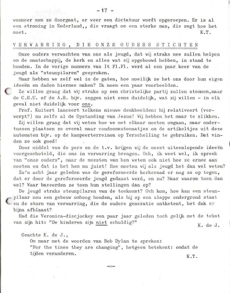 Beschrijving:It Fleurige Flittergat: 1970 6de jaargang nr. 8: Tweede Wereldoorlog: vervolg Over de oorlog: Interview met O.M. Miedema over de illegale pers. Verwarring die onze ouders stichten.